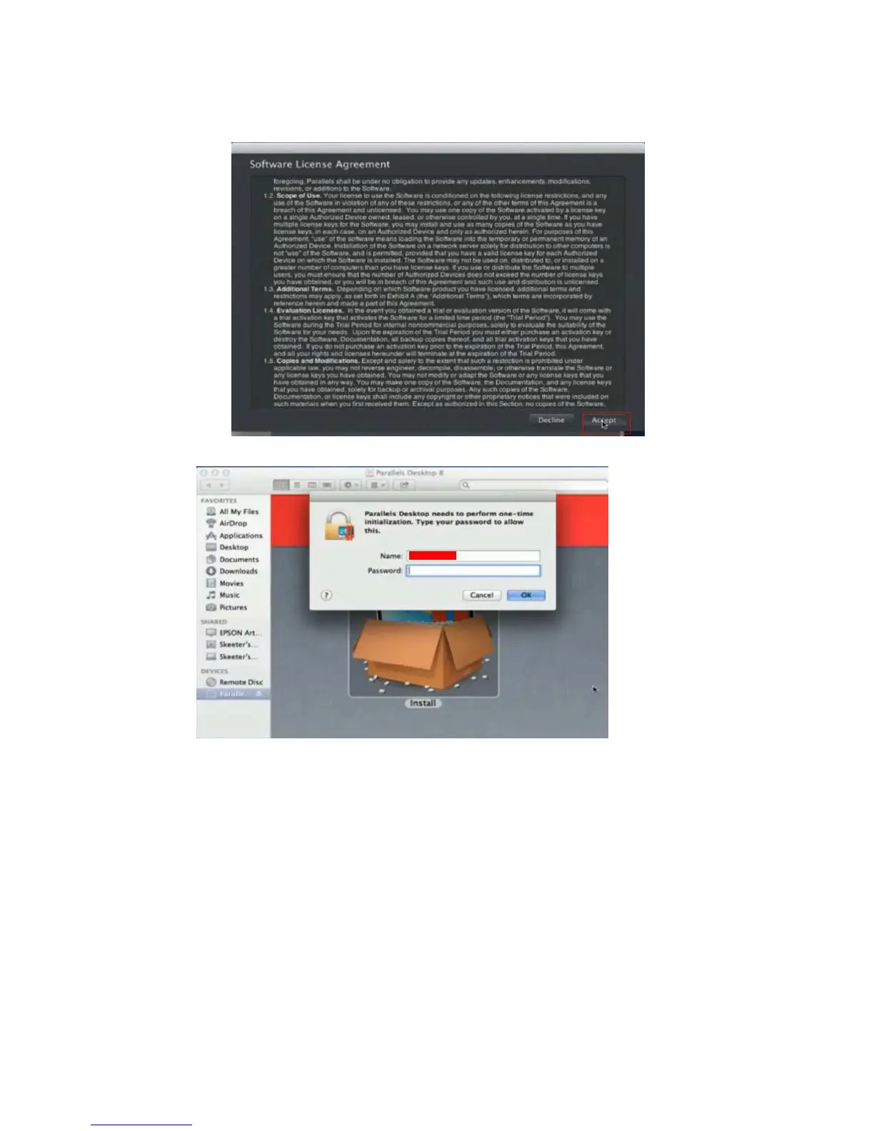 4) Enter your Mac OS X User Name and Password then press “OK