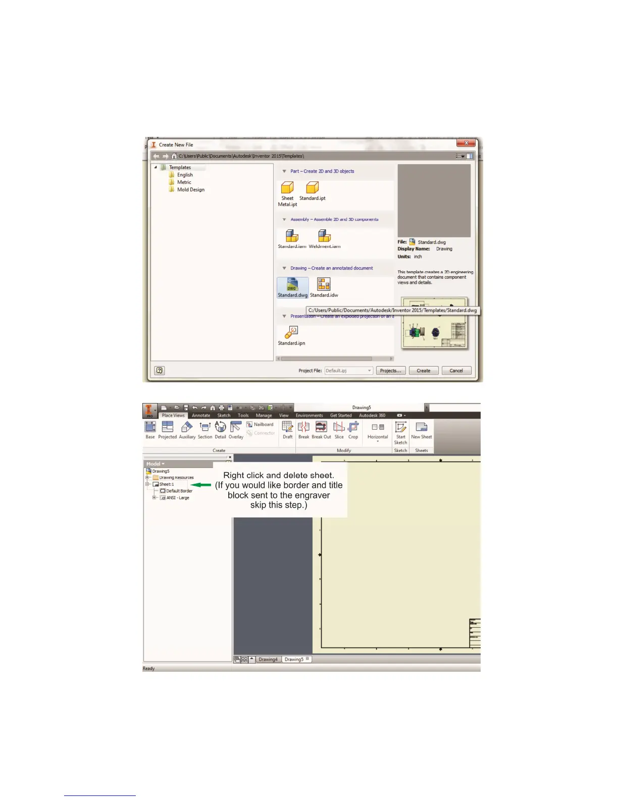 2. Delete border and title block by right clicking on sheet1 and selecting delete.