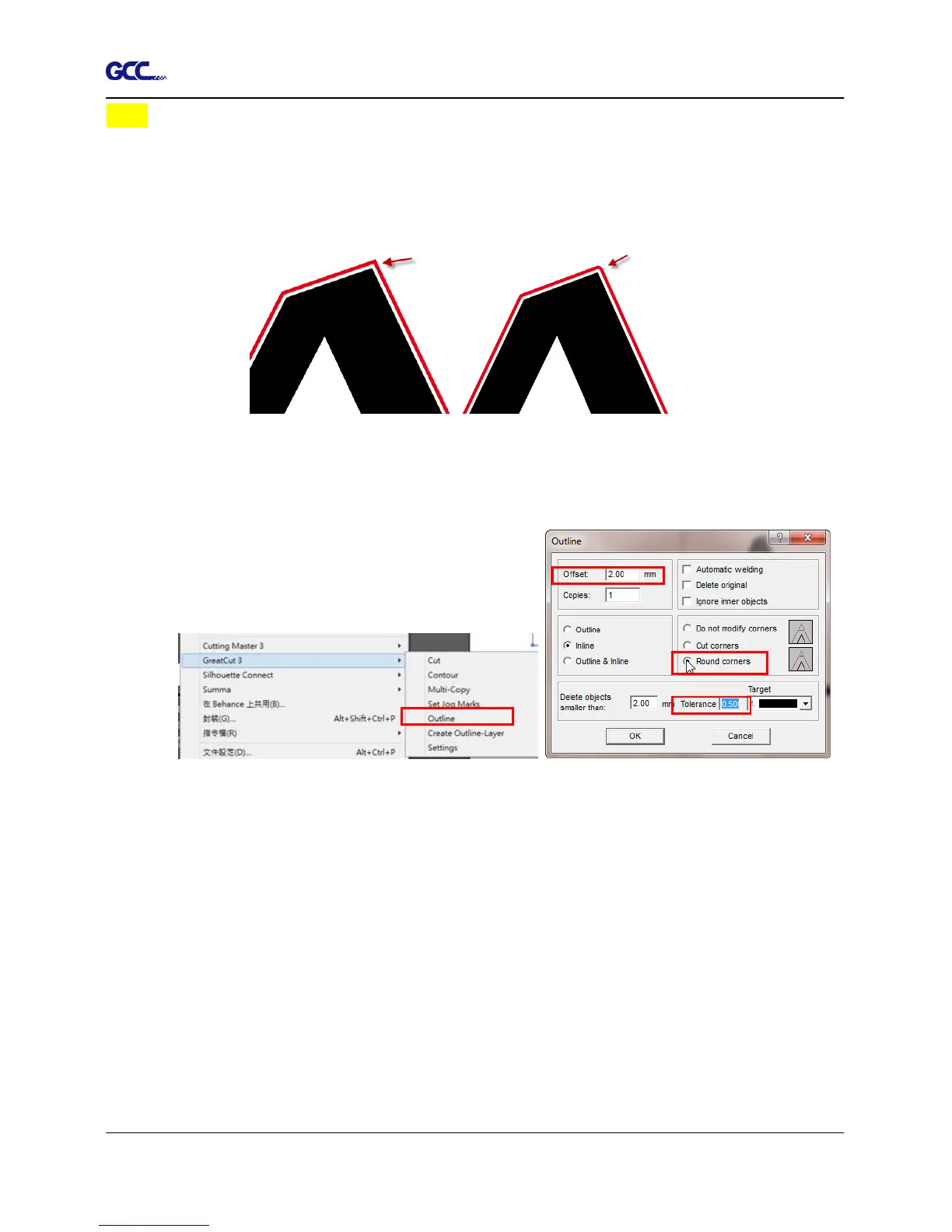 2. Select “Round corners” and set the value of “offset” and “tolerance.”
