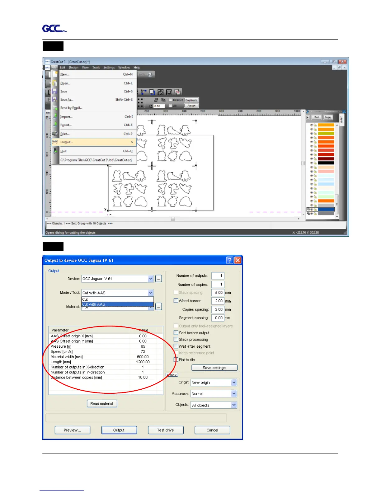 Step 4 Select Cut with AAS in Mode/Tool in the Output to device window.