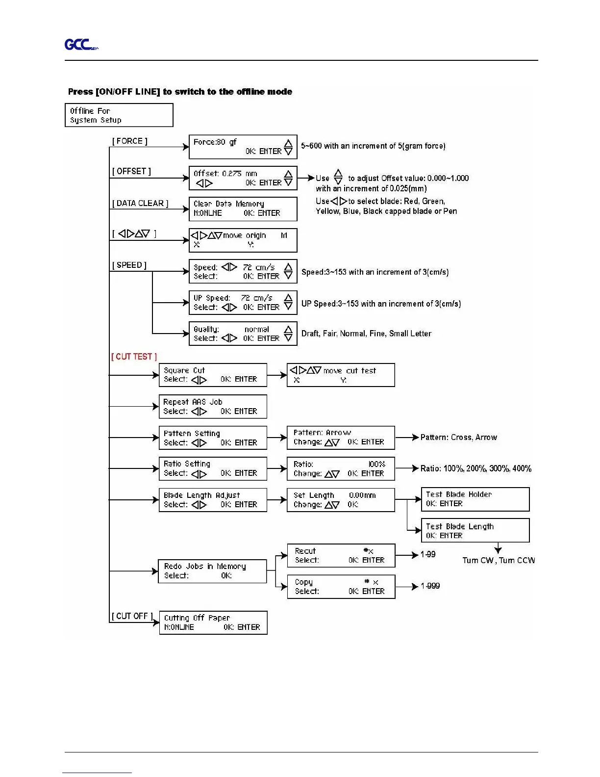 GCC Technologies RX Series - Menu in Off-Line Mode