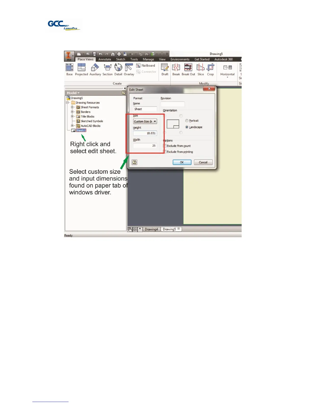 3. Set sheet size to match working area of engraver. Engraver working area