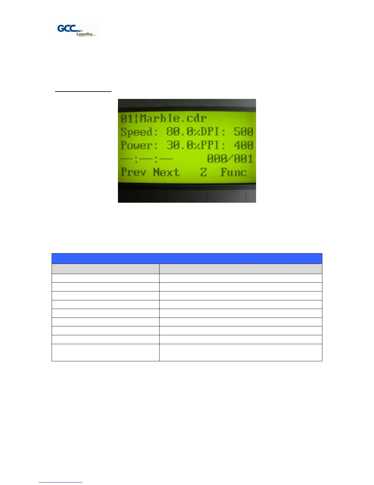 information such as the current job’s name, Speed, Power, PPI, DPI, processing / remaining