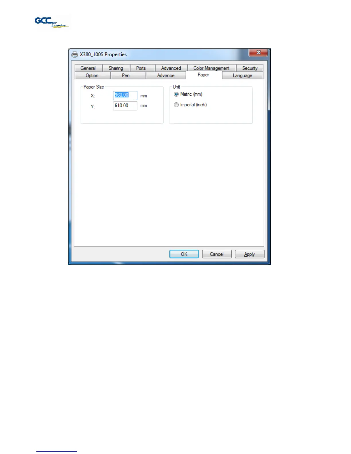The paper size represents your total work area. Ensure that the paper size is never set greater than the X380’s