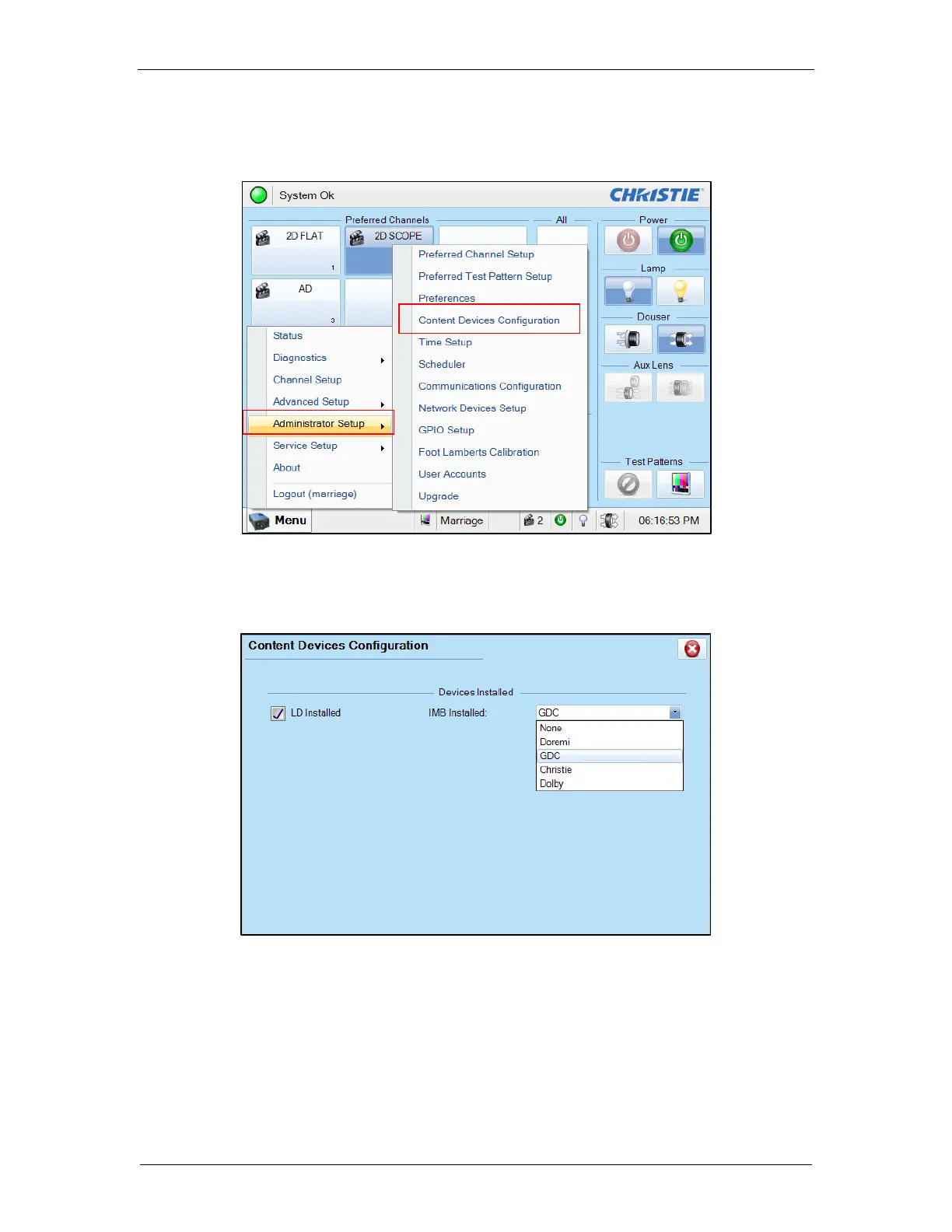 4. Select [Menu] → [Administrator Setup] → [Content Devices Configuration] (as
