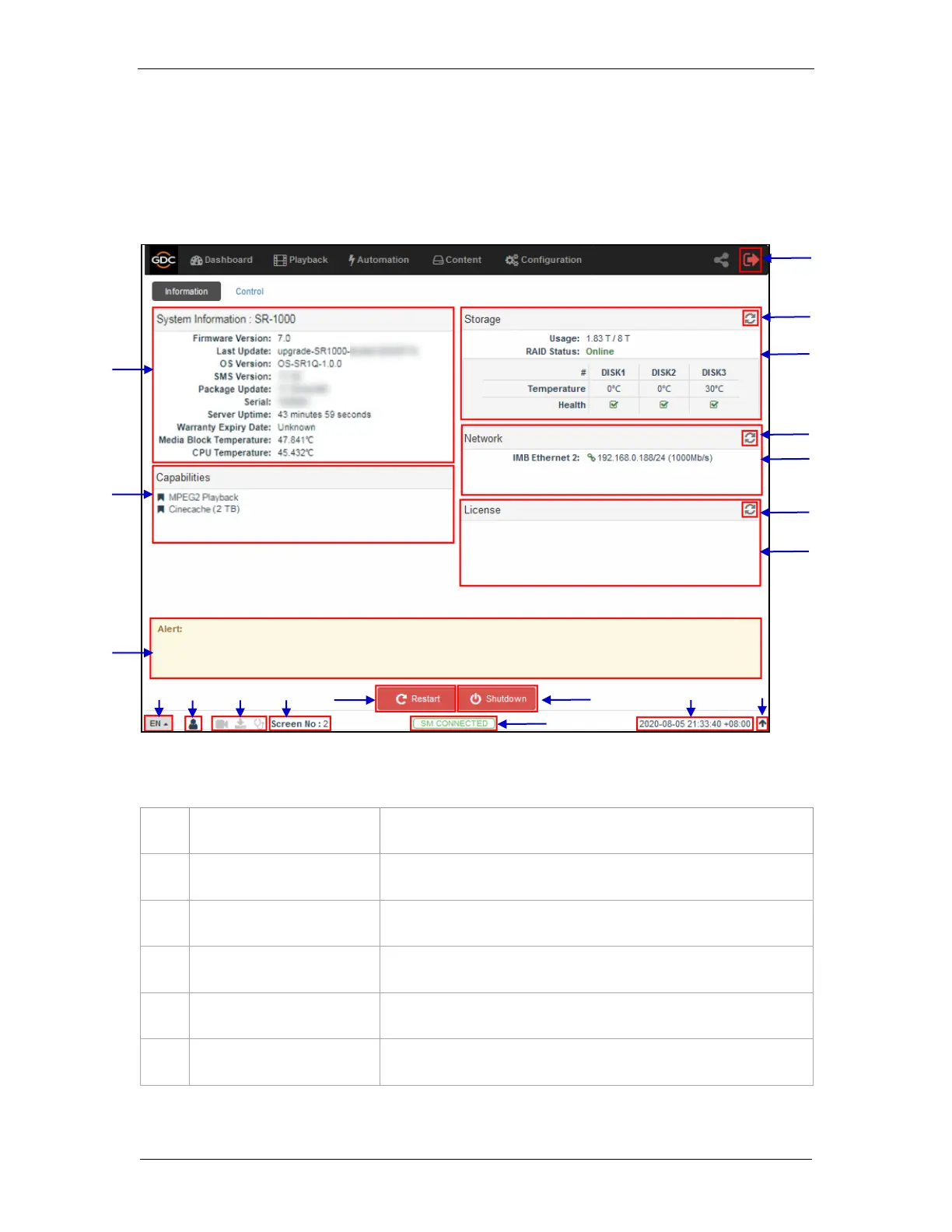 SR-1000 Web UI Dashboard menu displays basic information related to the SR-1000, such as