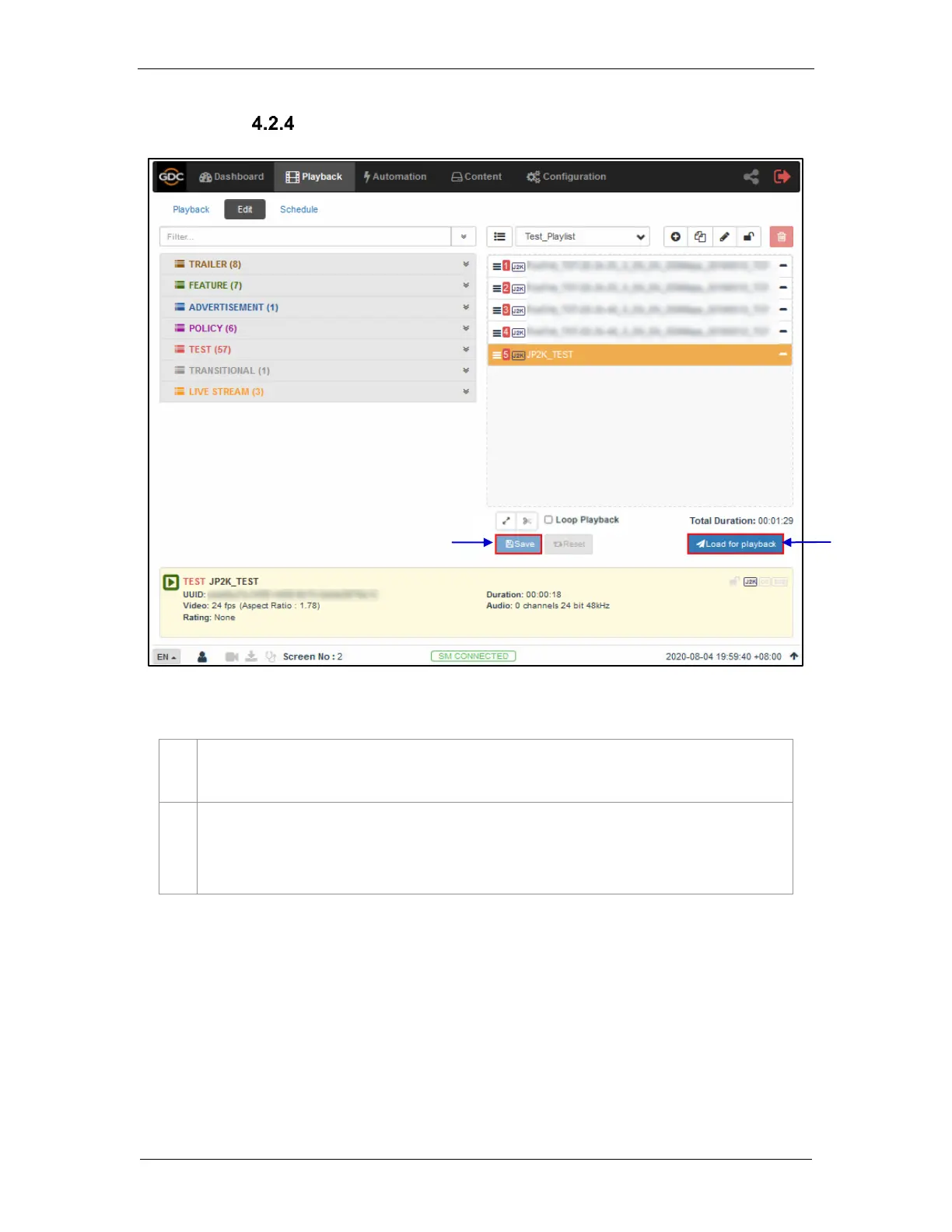 Click on the Load for Playback button to load the newly created playlist to the Playback interface.
