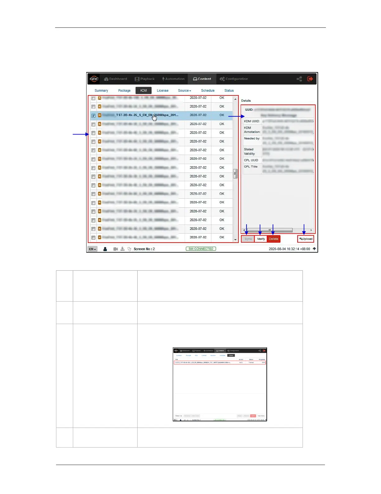 When a KDM is selected from the list, KDM details are displayed on