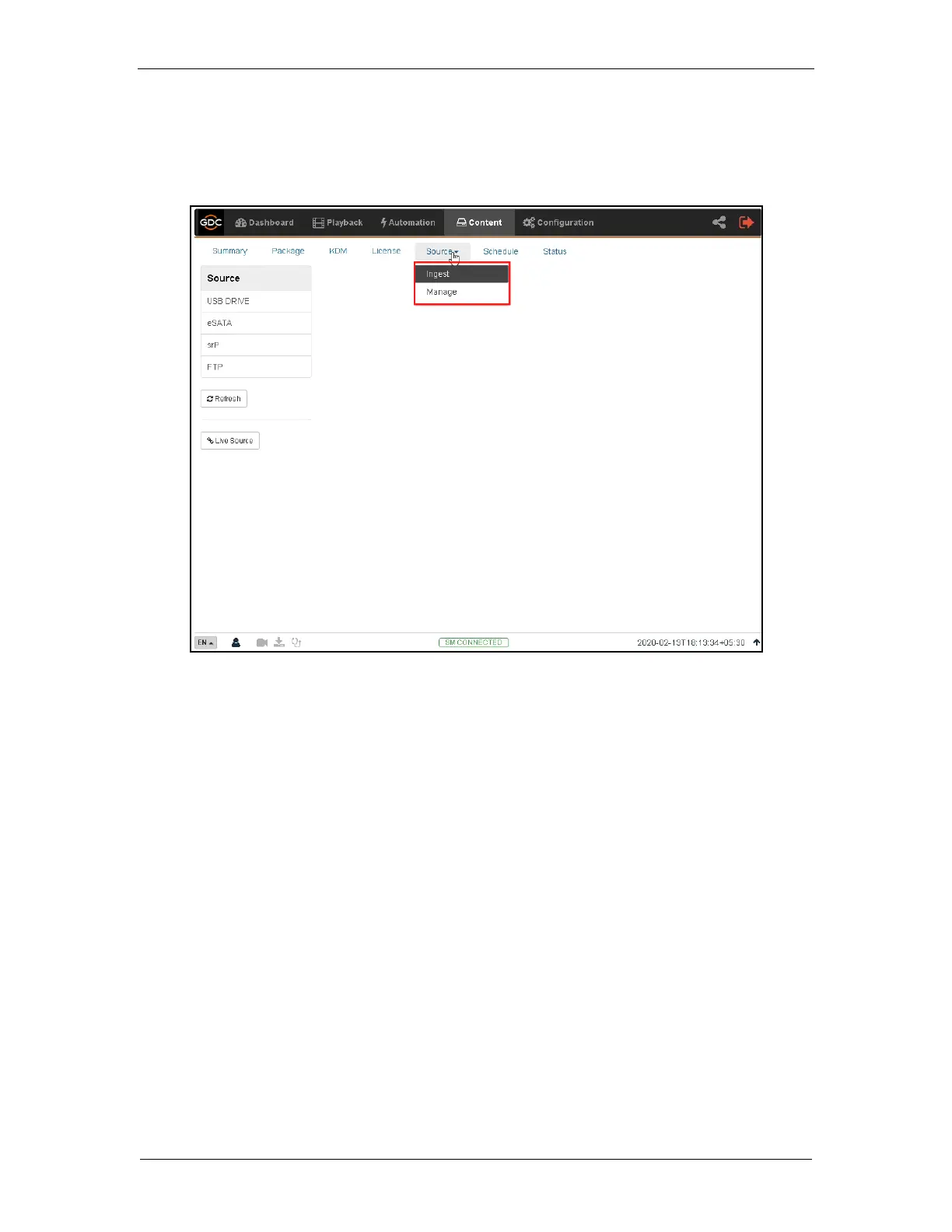 The Source sub-tab is used to configure and manage the content ingest sources on the