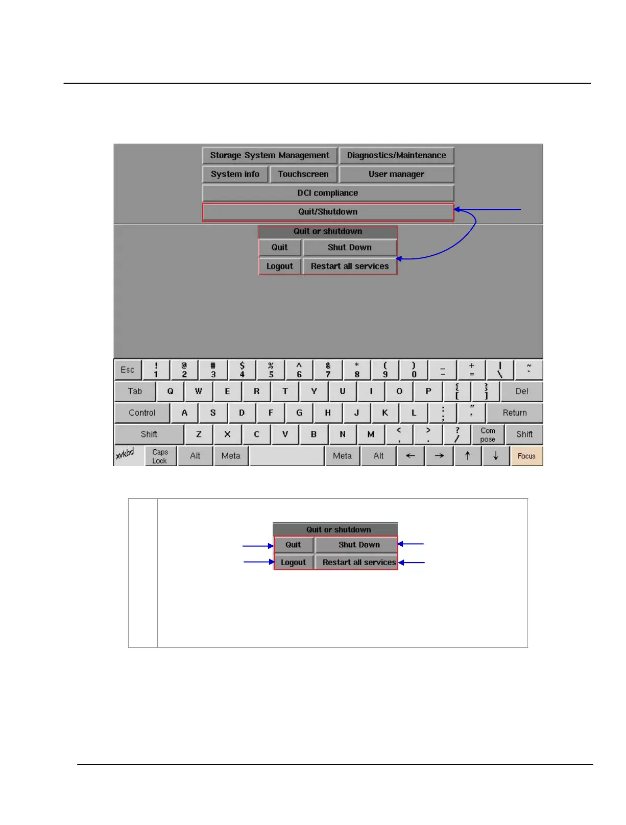 Main menu, select Quit/ Shutdown. A small window shows the Quit/Shutdown menu.