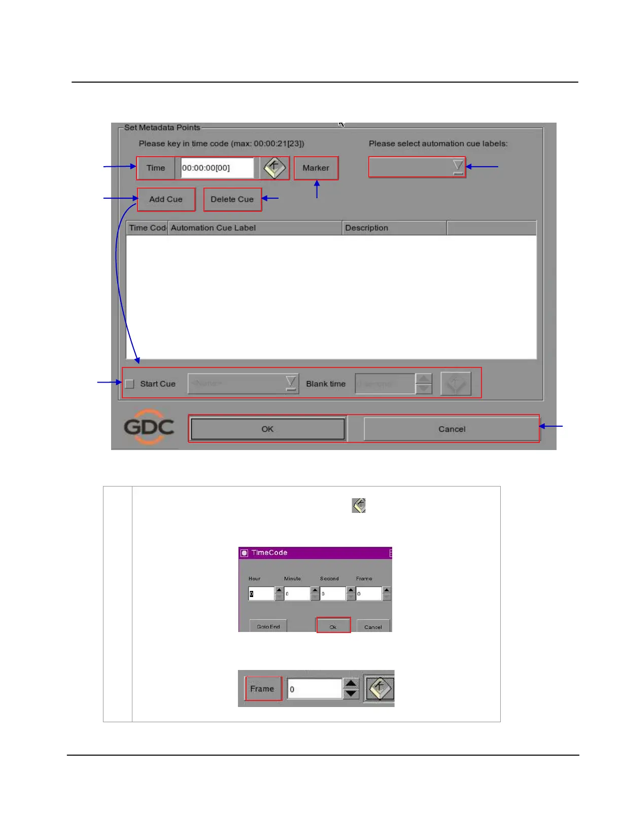 To specify a frame for the activation of the cue, press the