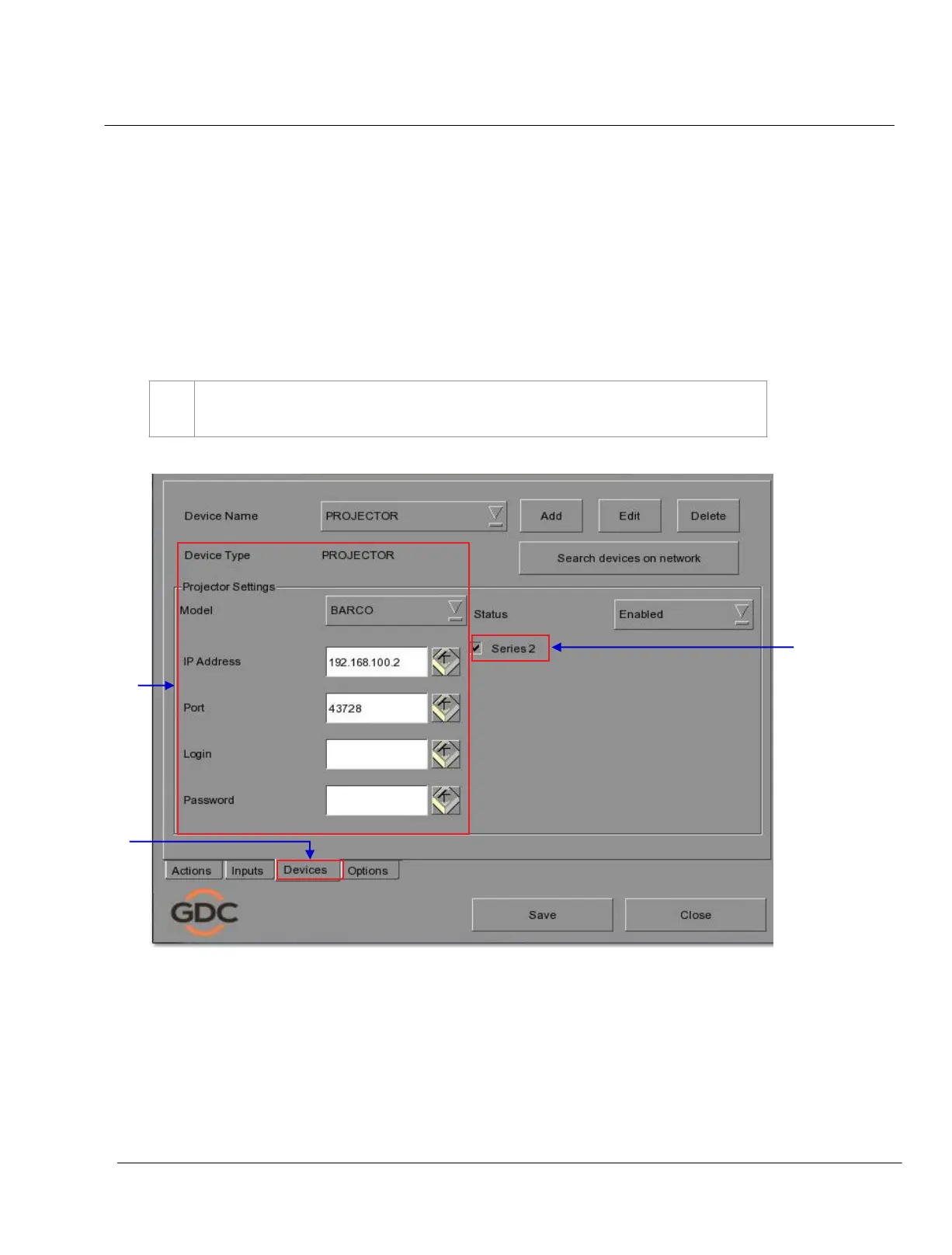Automation menu, press Devices. This section will describe individual projector setup.