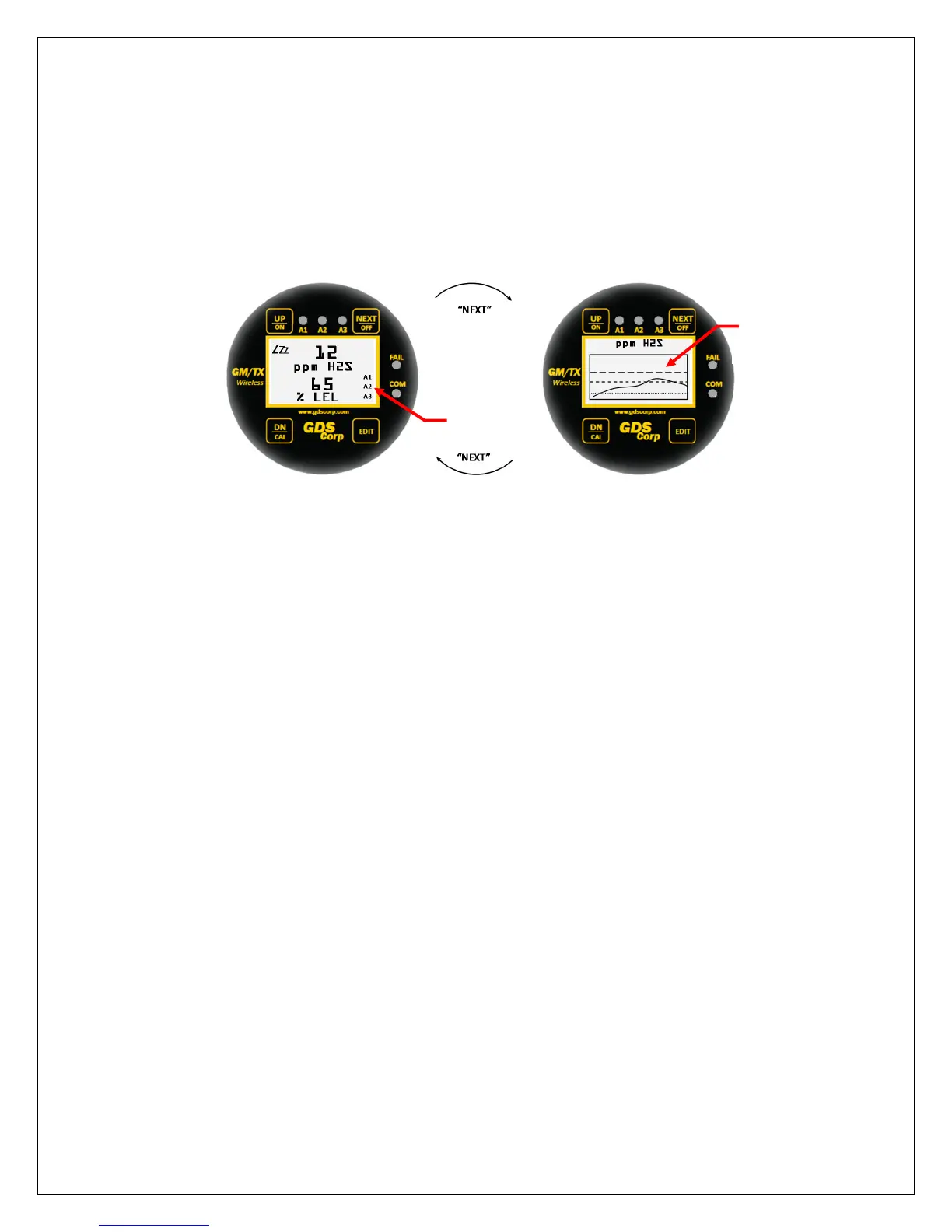 Pressing the “NEXT” key allows the user to cycle through the available data and trend screens. In single