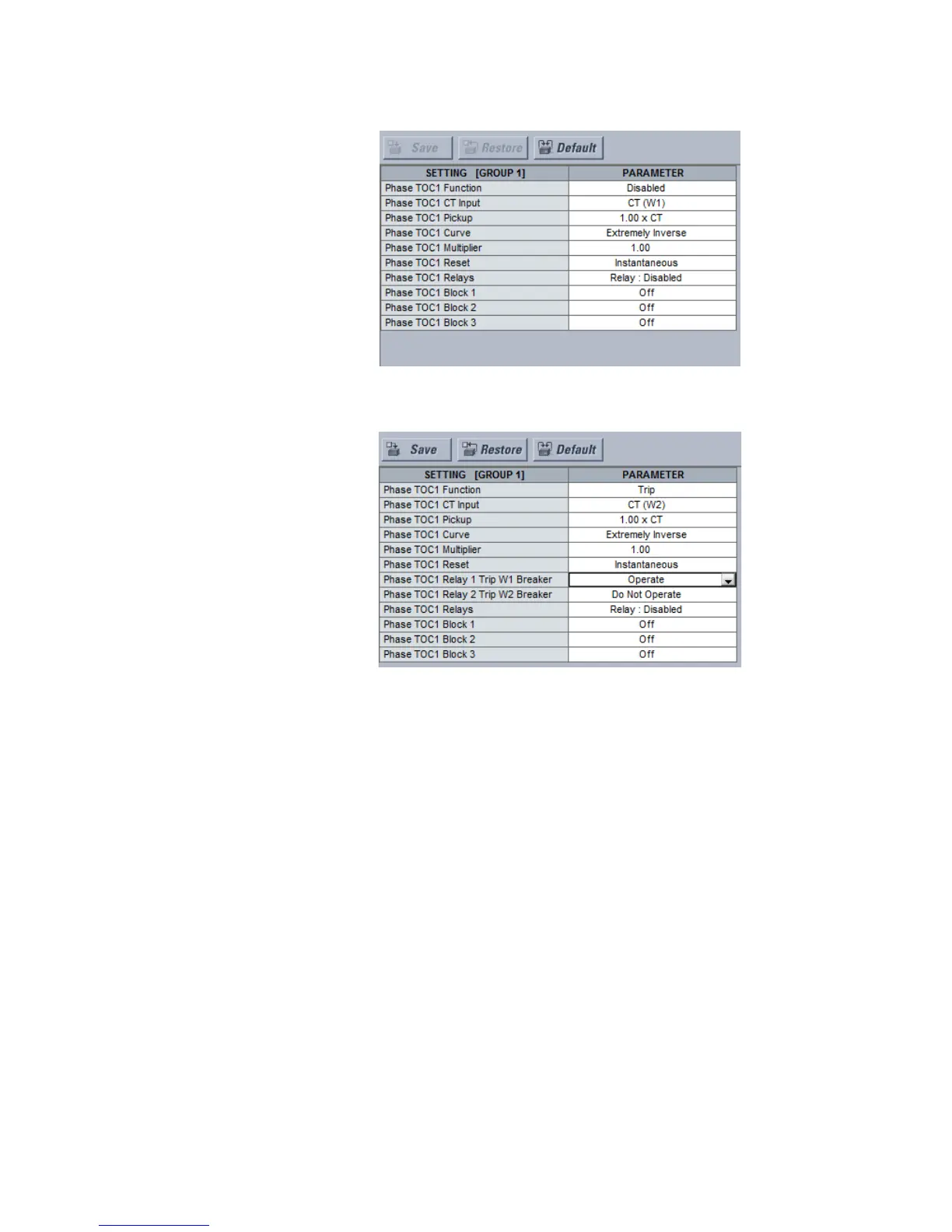 Setting Phase TOC1 Relay 1 Trip W1 Breaker to Operate results in output relay 1 (W1