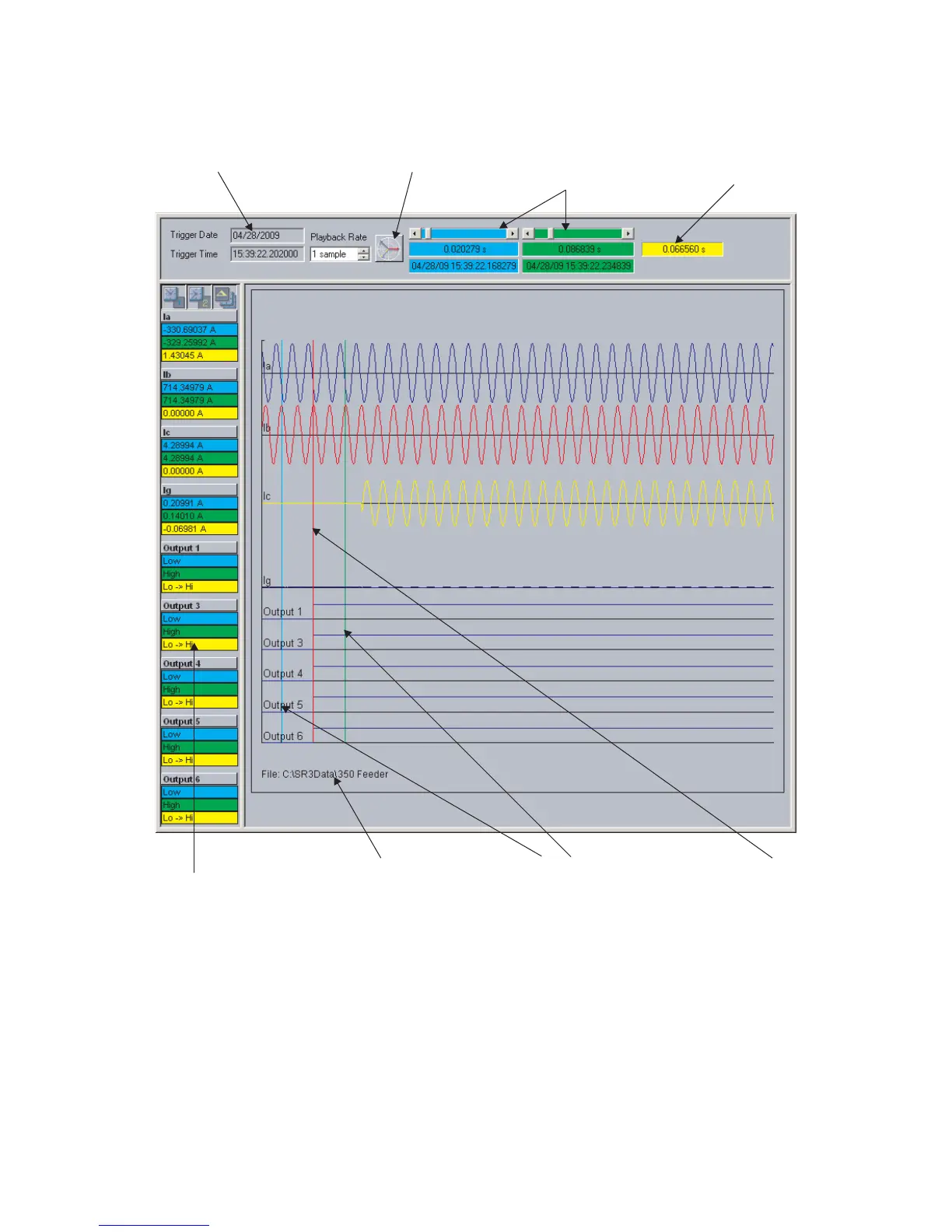 • The date and time of the trigger are displayed at the top left corner of the window. To