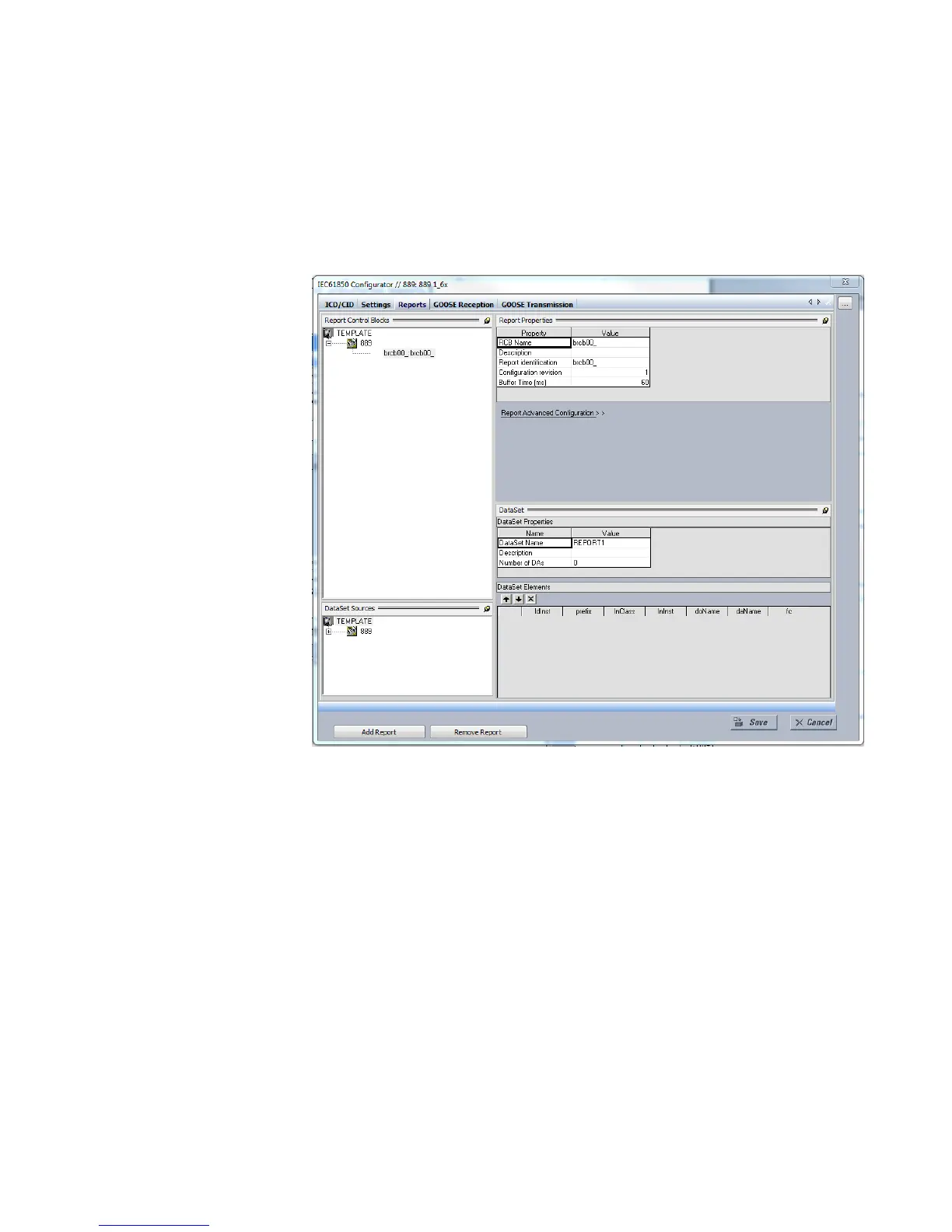 Reports The Reports tab in IEC 61580 Configurator permits configuration of data sets and report