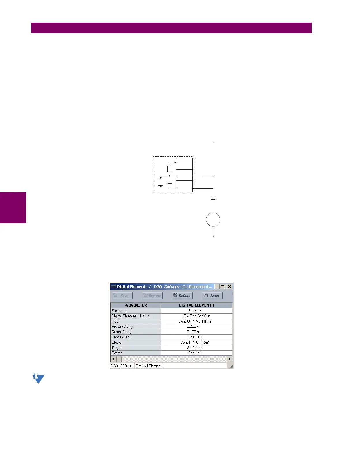 The settings to use digital element 1 to monitor the breaker trip circuit are indicated below (EnerVista UR Setup example