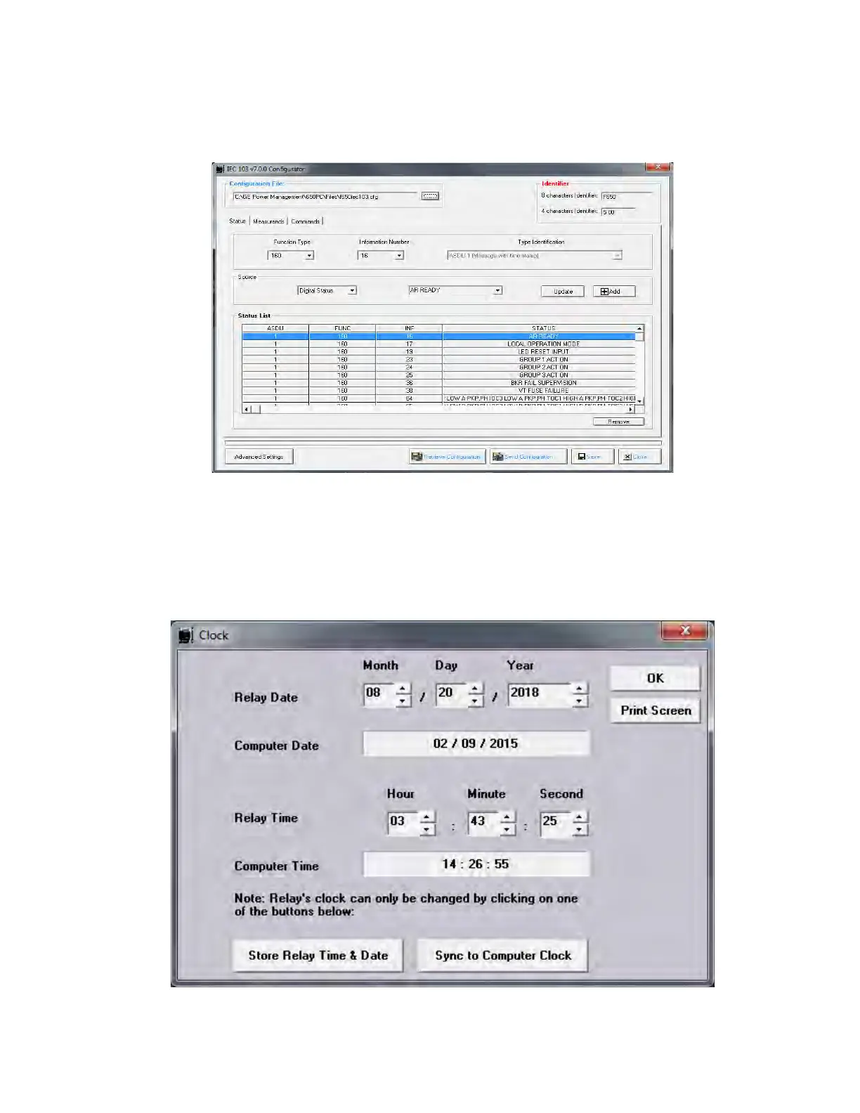 This menu allows updates to the date and time of the relay, either synchronizing them with the PC clock, or entering the