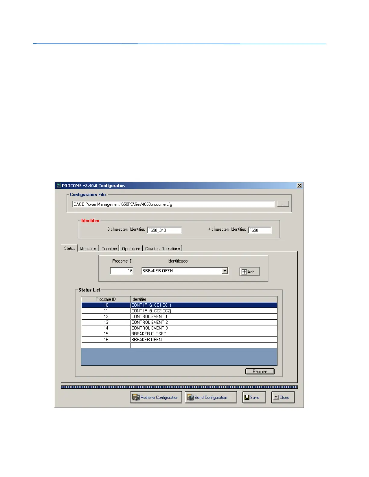 Configuration. Changes can be saved to the f650procome.cfg configuration file, and then sent to the relay by clicking