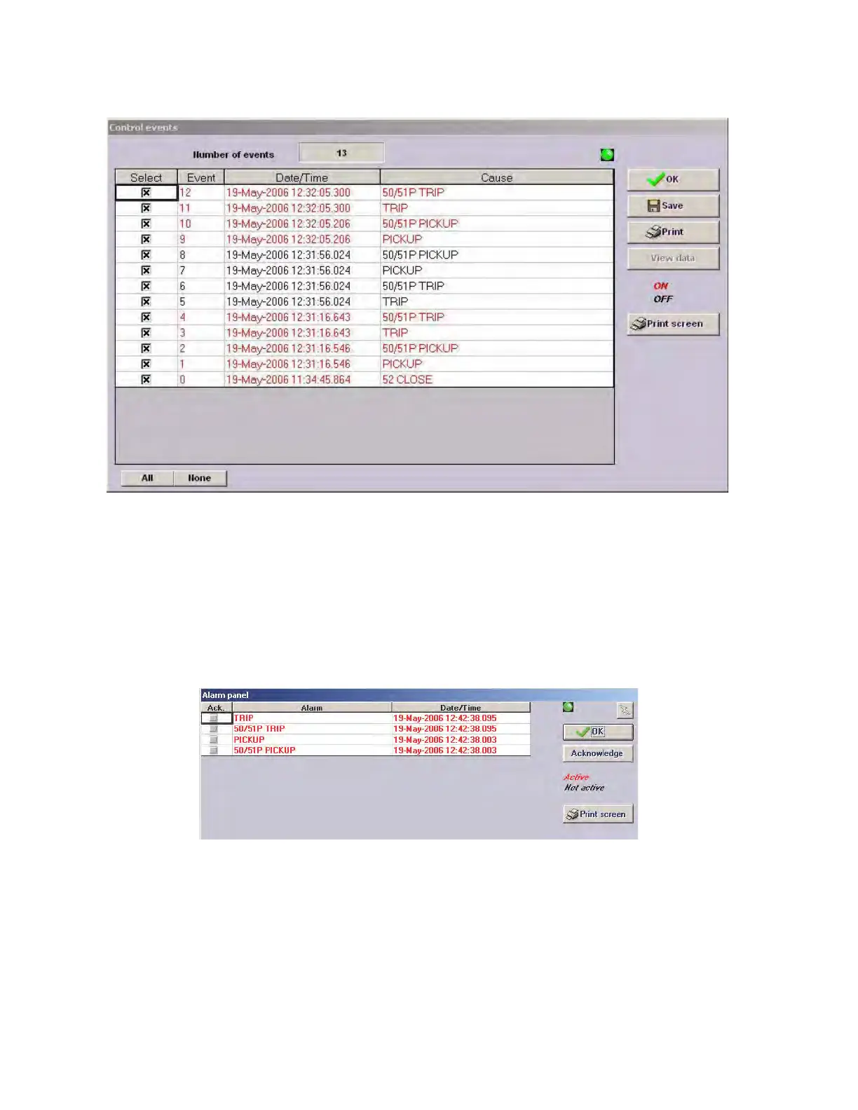 The following screen provides information about the issued alarms. The screen shows information about their status: