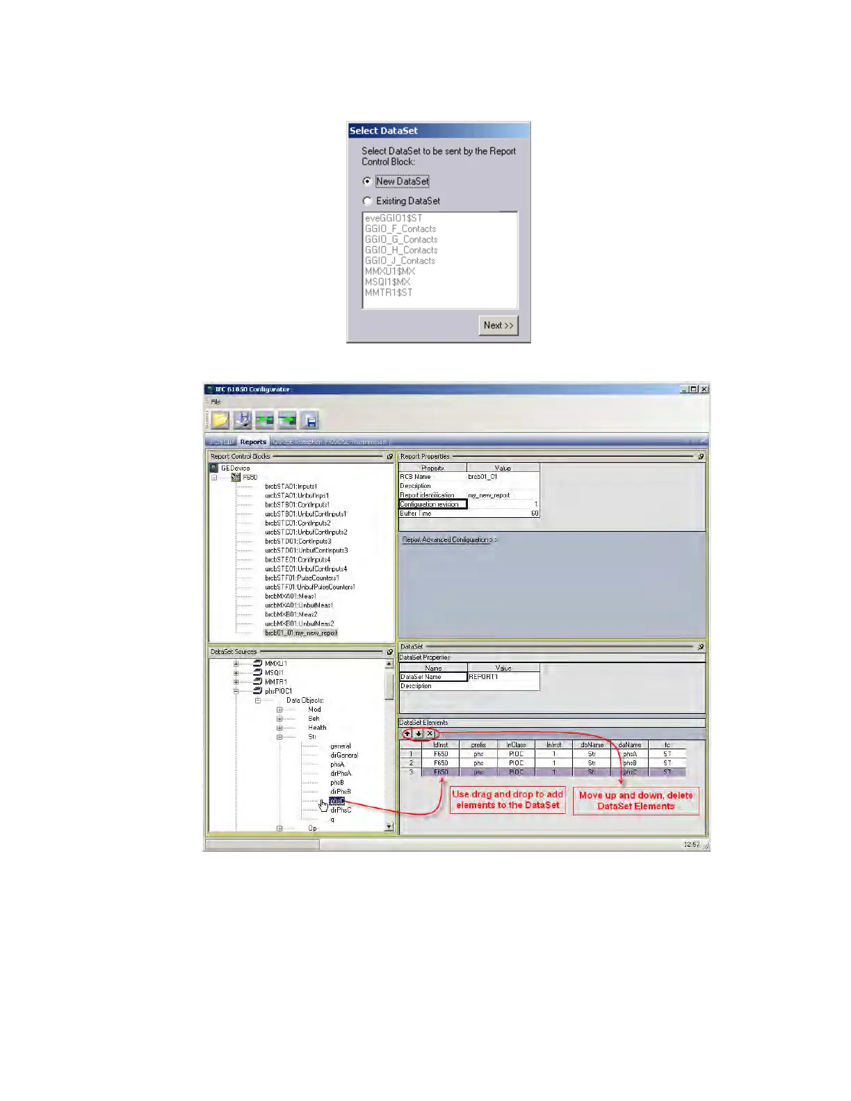 and drag and drop the desired element to the Data Set Elements on the right. In the F650 relay, Data Sets for Reports can