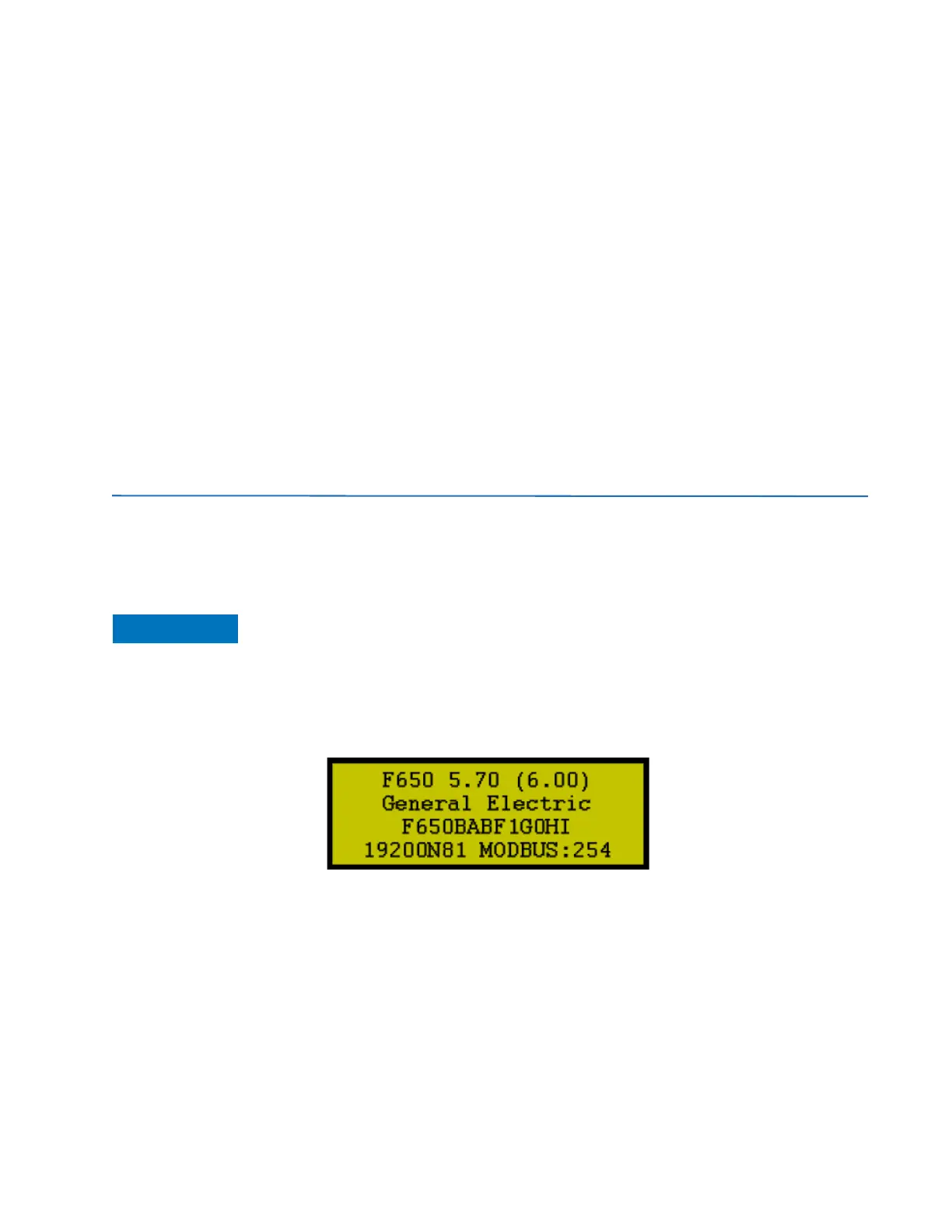 “GENERAL ELECTRIC”, the relay model and the default front RS232/USB port communication parameters.