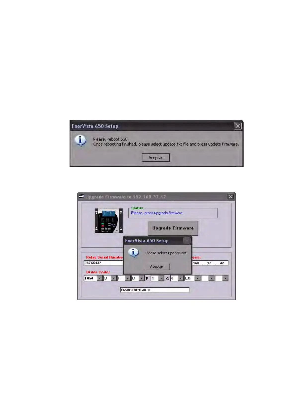 shows a message requesting a reboot of the 650 (turn the relay off and then back on) to continue with the upgrade