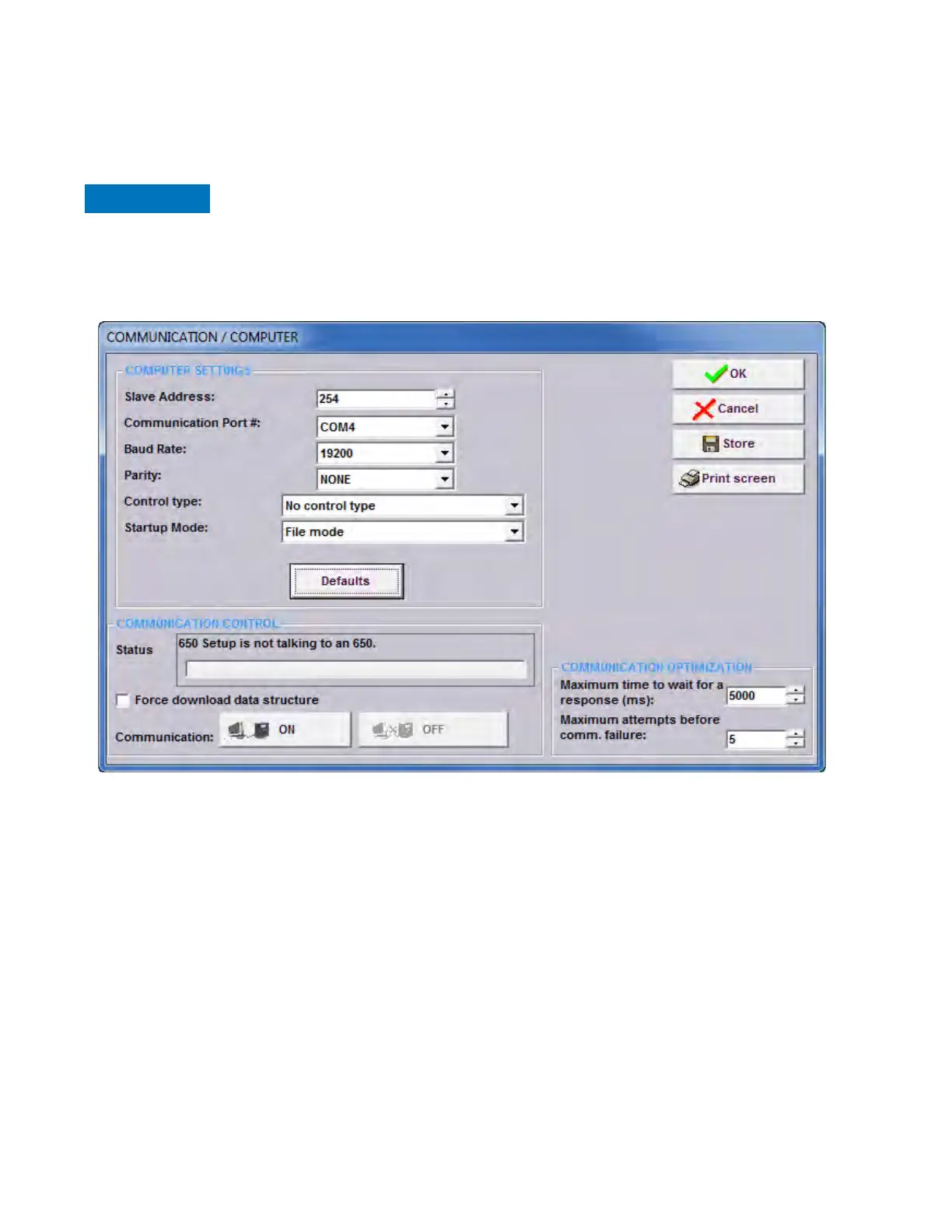• Computer settings: Main communication parameters for serial communication and control type selection.