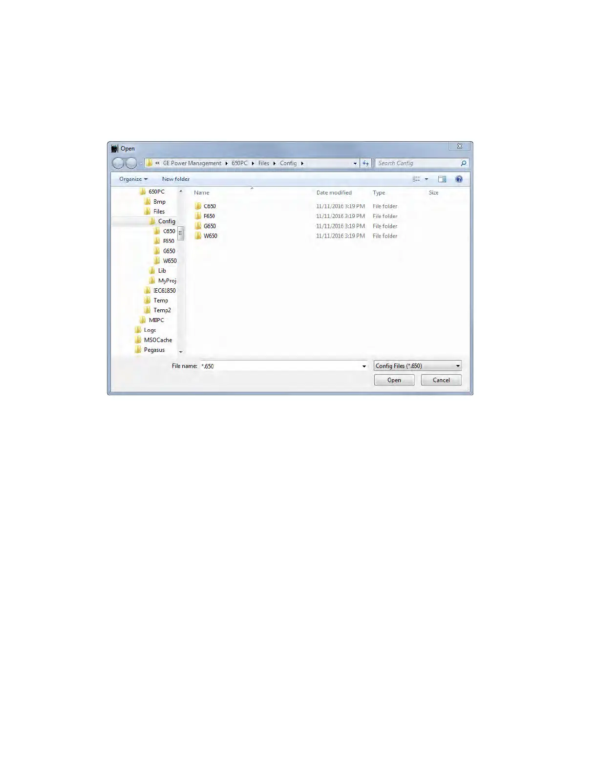 In these options, the EnerVista 650 Setup program opens a dialog box (with default path to Files > Config program folder)