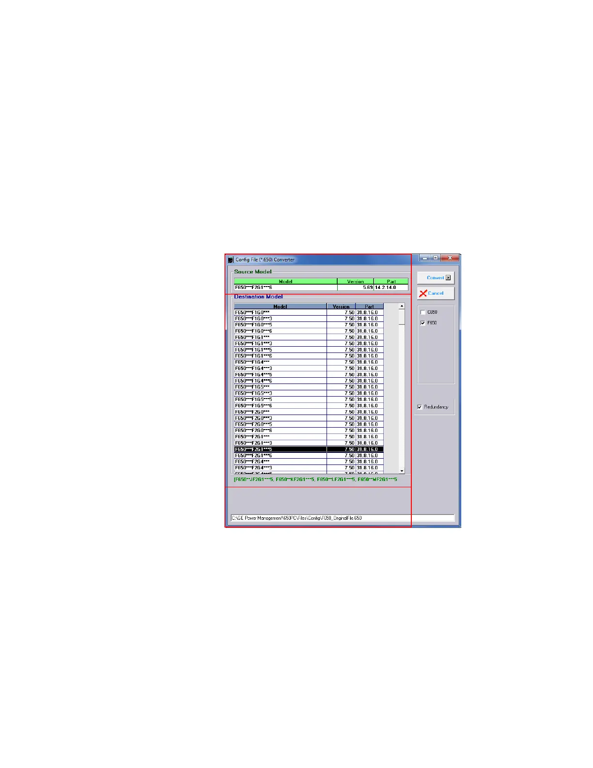 Source Model: Indicates source F650 model and original version of selected file.