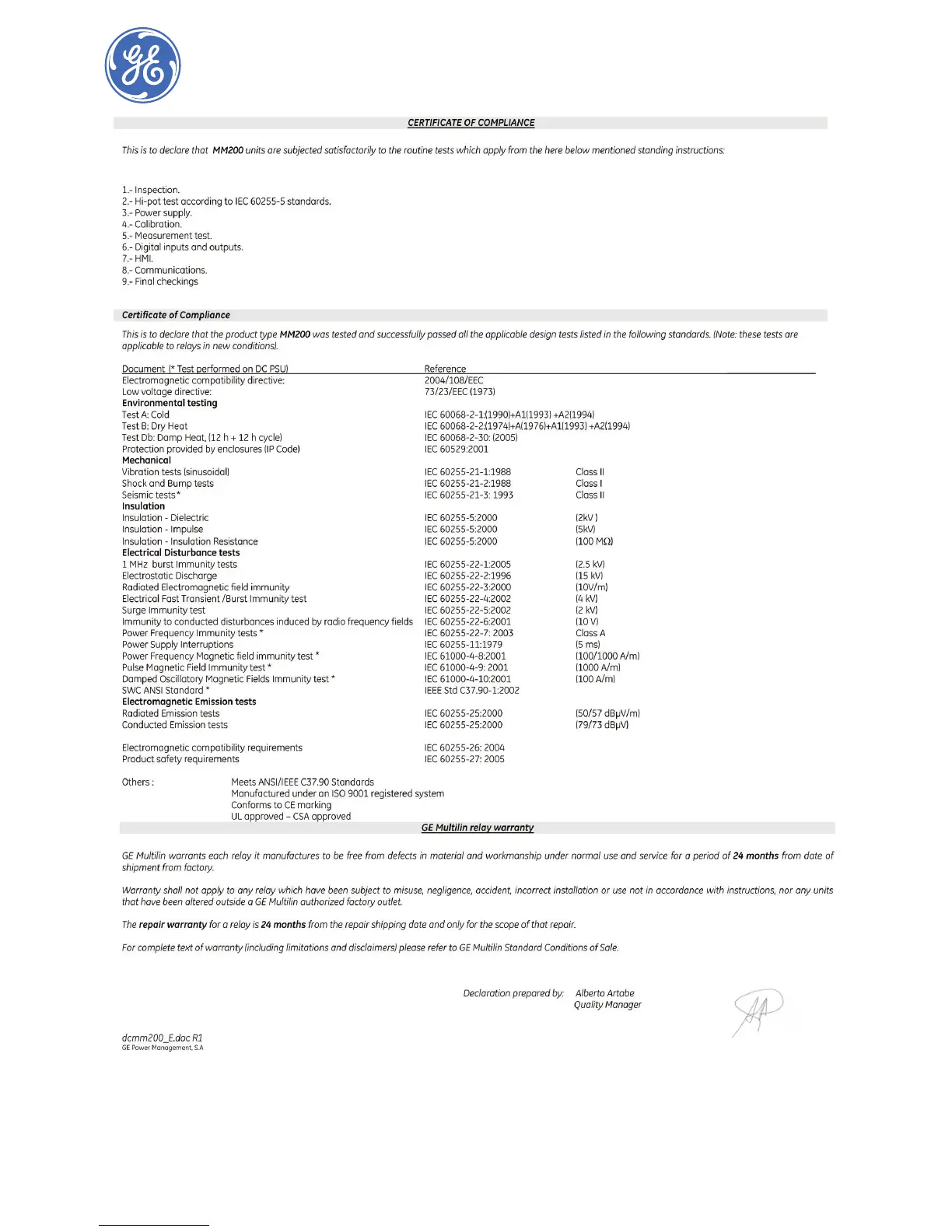 GE Multilin MM200 - Certificate of Compliance