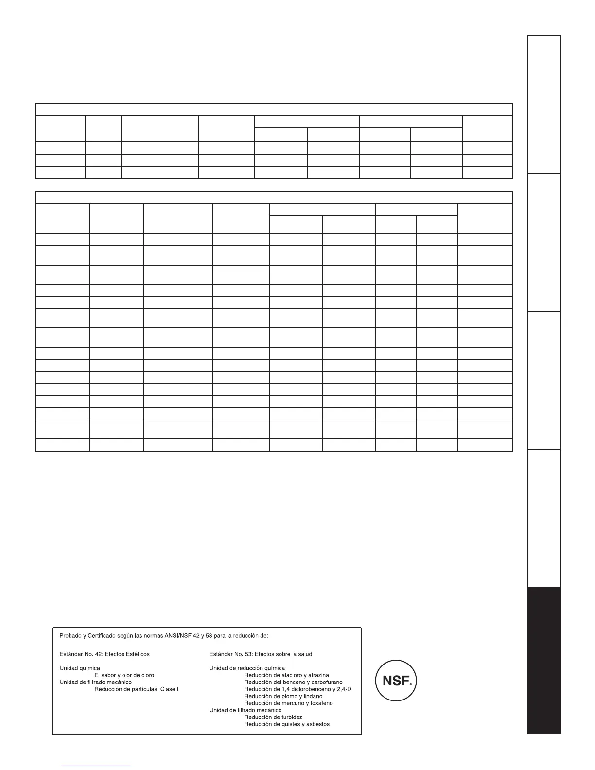 Este sistema se ha sometido a las pruebas NSF/ANSI 42/53 a n de reducir las sustancias presentadas a continuación. Se redujo la concentración de las sustancias indicadas en el agua que