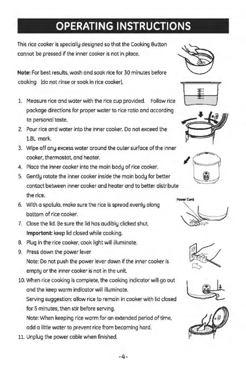 GE 169111 - Operating Instructions; Standard Rice Cooking Procedure