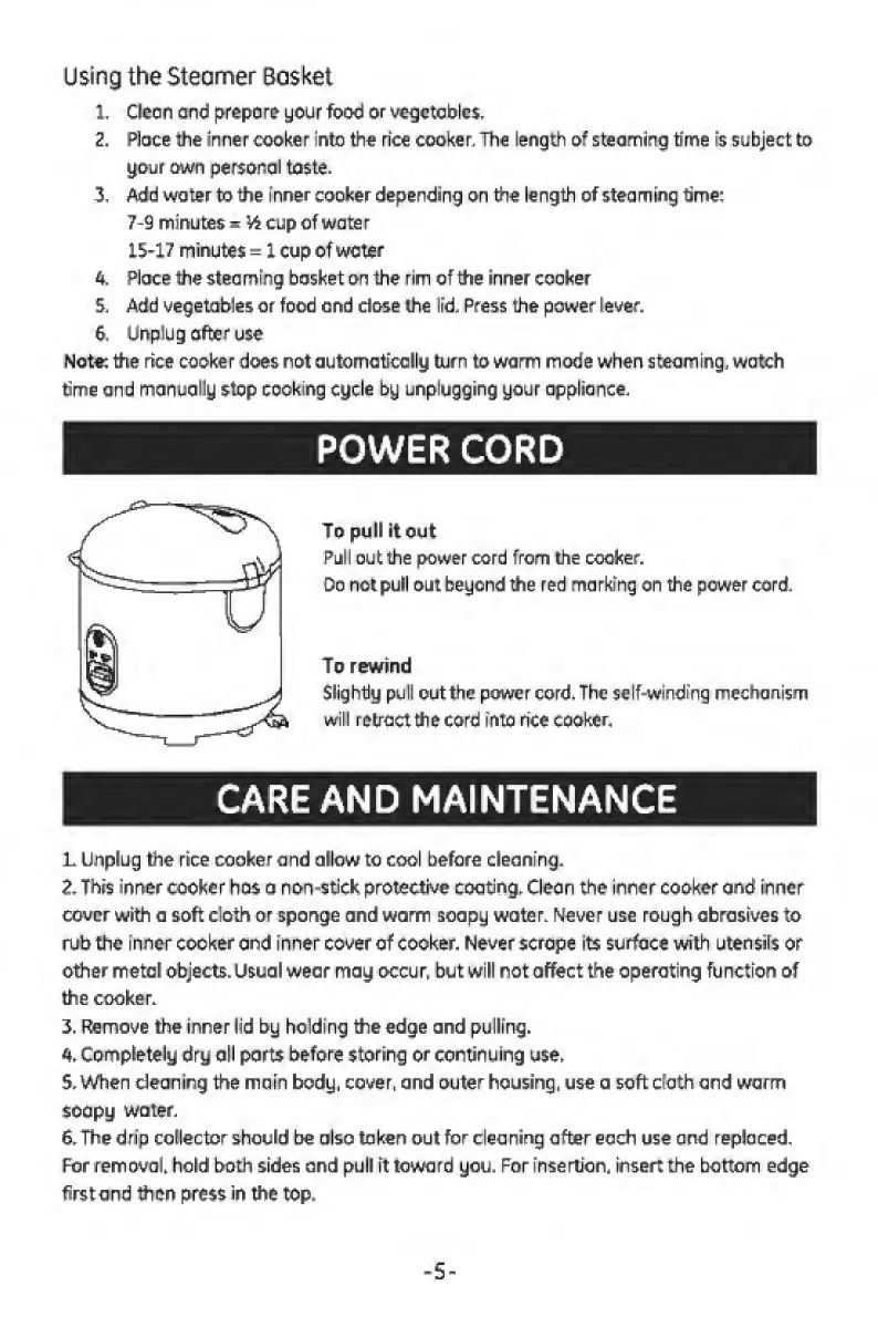 GE 169111 - Using the Steamer Basket; Care and Maintenance; Cleaning and Upkeep Procedures
