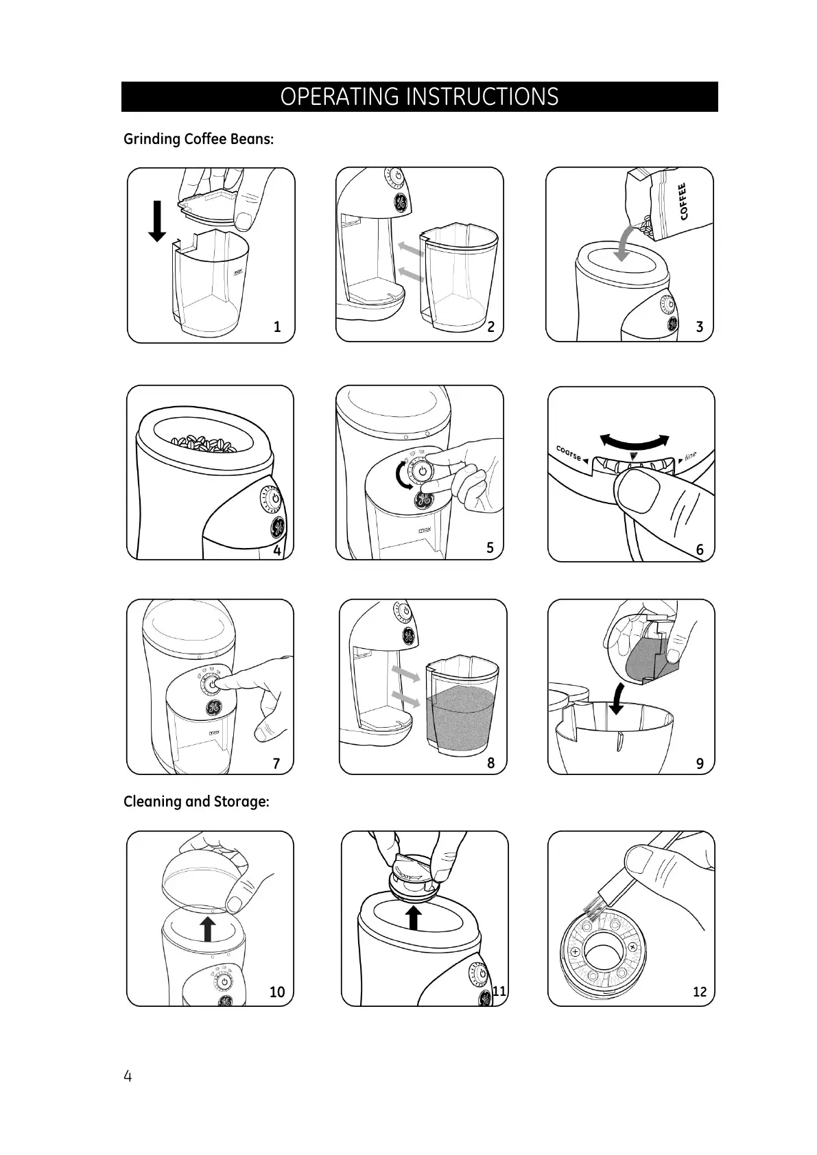 GE 169132 - OPERATING INSTRUCTIONS; Grinding Coffee Beans Guide; Cleaning and Storage Guide