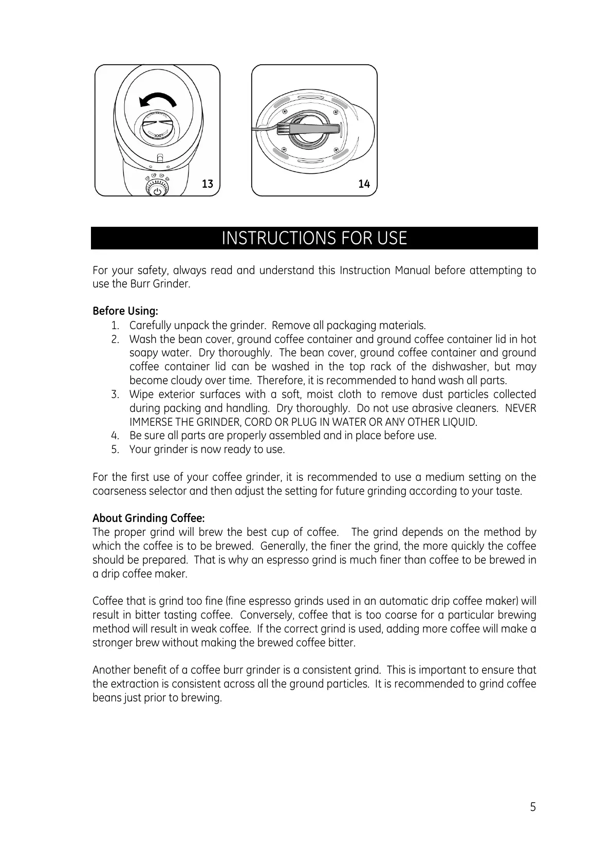 IMMERSE THE GRINDER, CORD OR PLUG IN WATER OR ANY OTHER LIQUID.