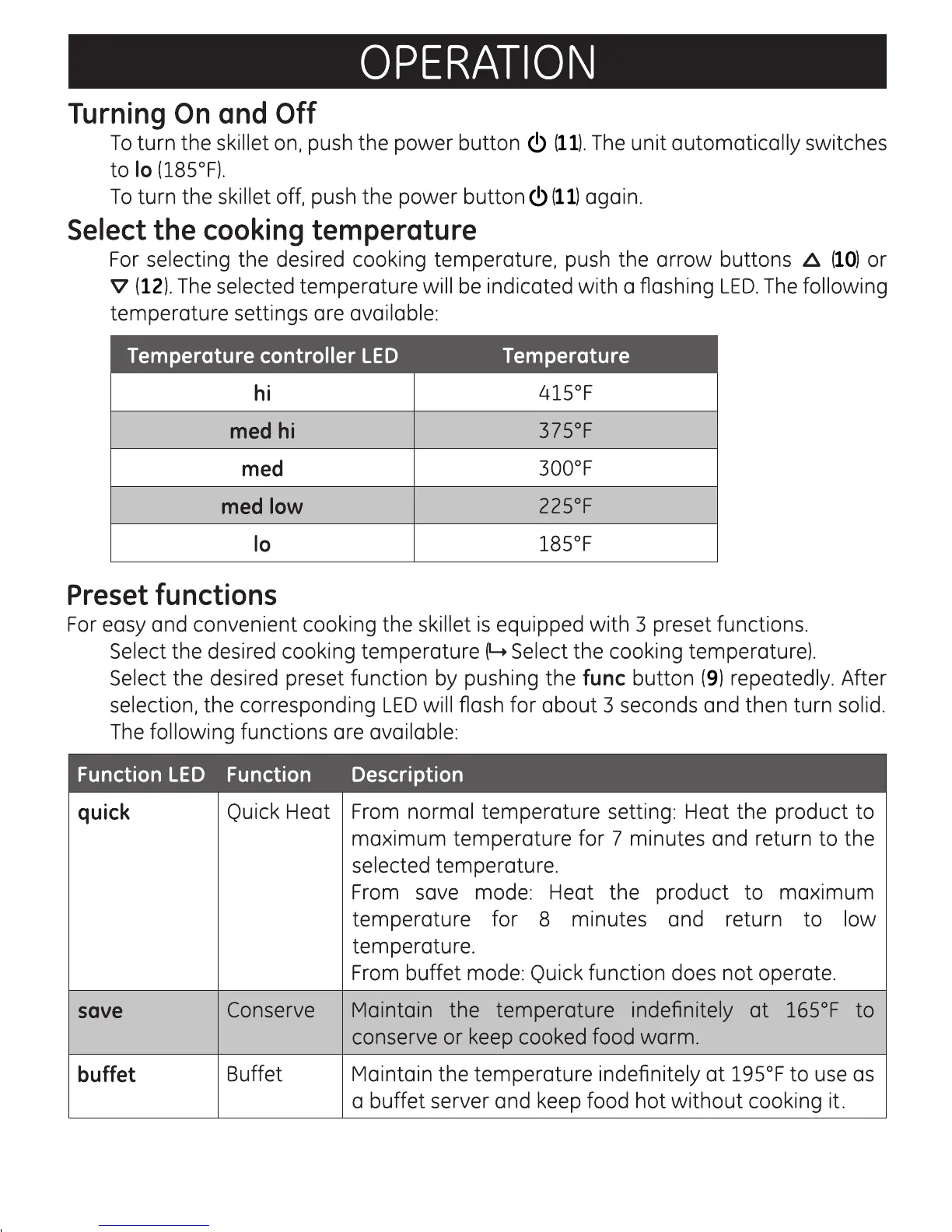 GE 169216 - Turning On and Off; Select Cooking Temperature; Preset Functions