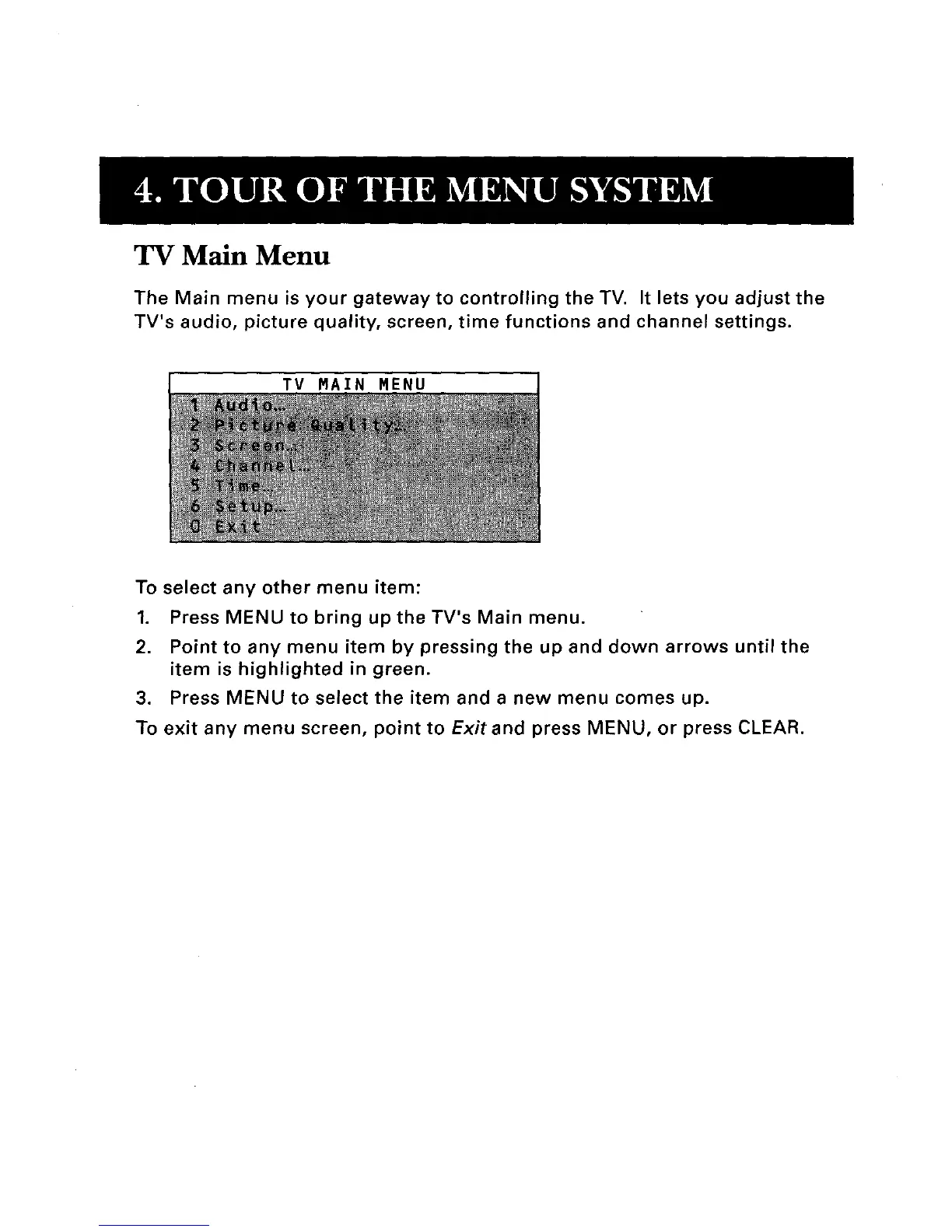 To exit any menu screen, point to Exitand press MENU, or press CLEAR.