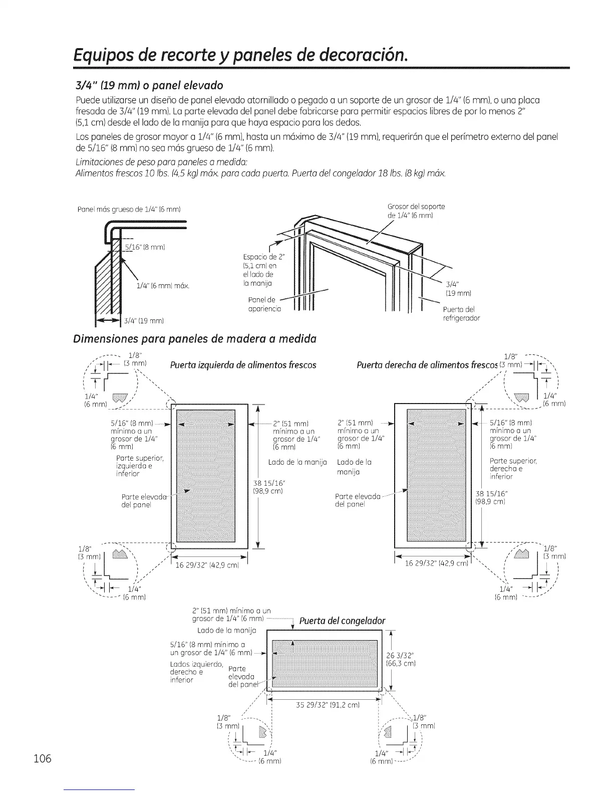 fresada de :3/4"(19 ram).Laparte elevada del panel debe fabricarse para permitir espacios libres de pot Io menos 2"