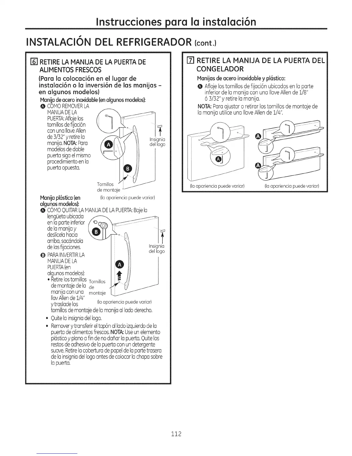 instalaci6n o la inversi6n de las manijas -