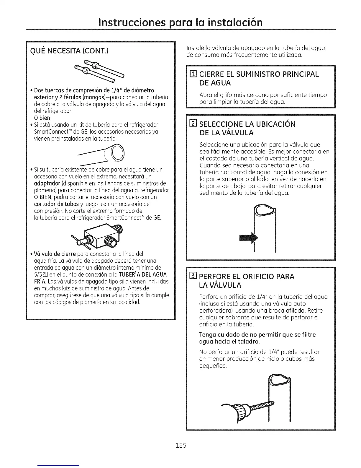 Perfore un orificio de 1/4" en la tuberia del agua