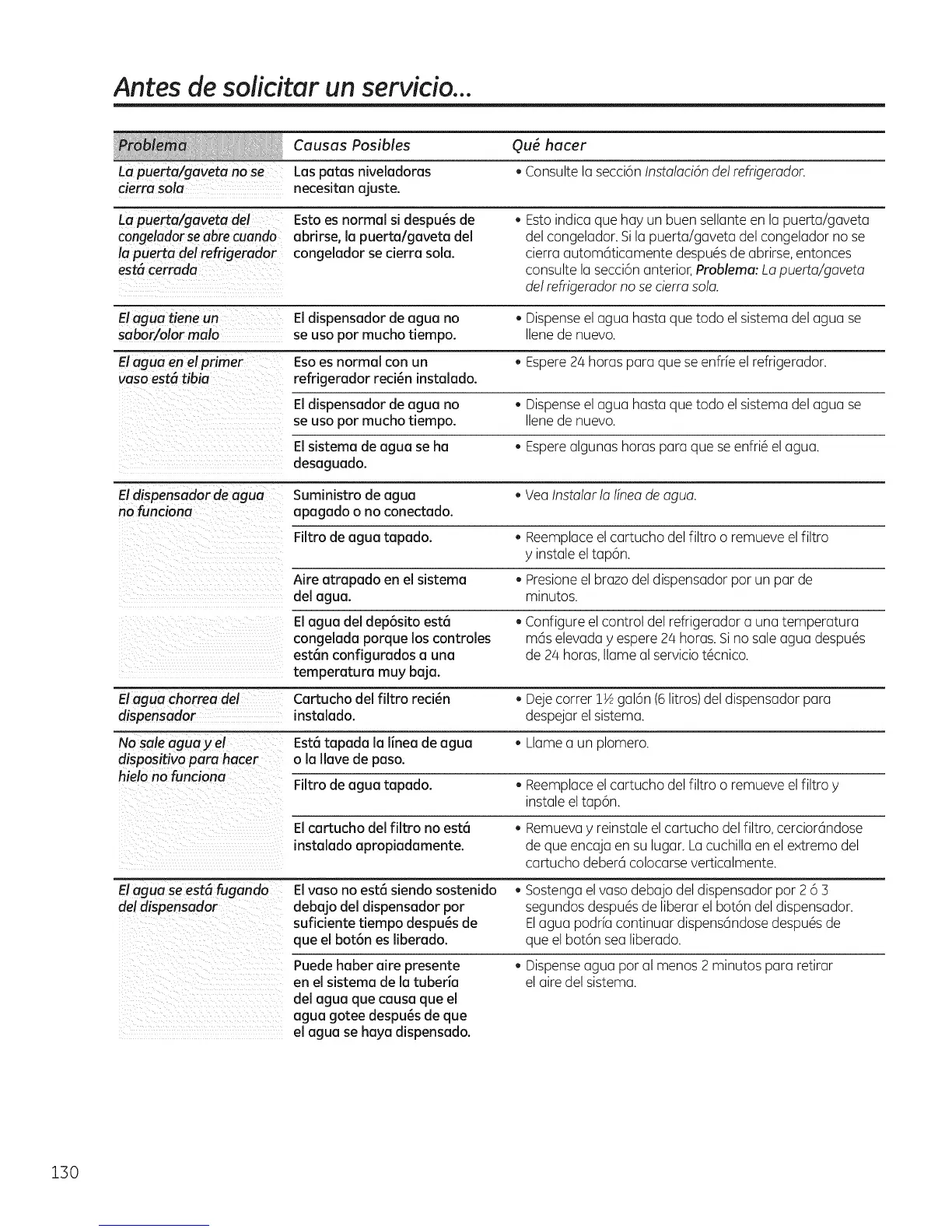 No sale agua y el Est6 tapada la linea de agua • Llame a un plomero.