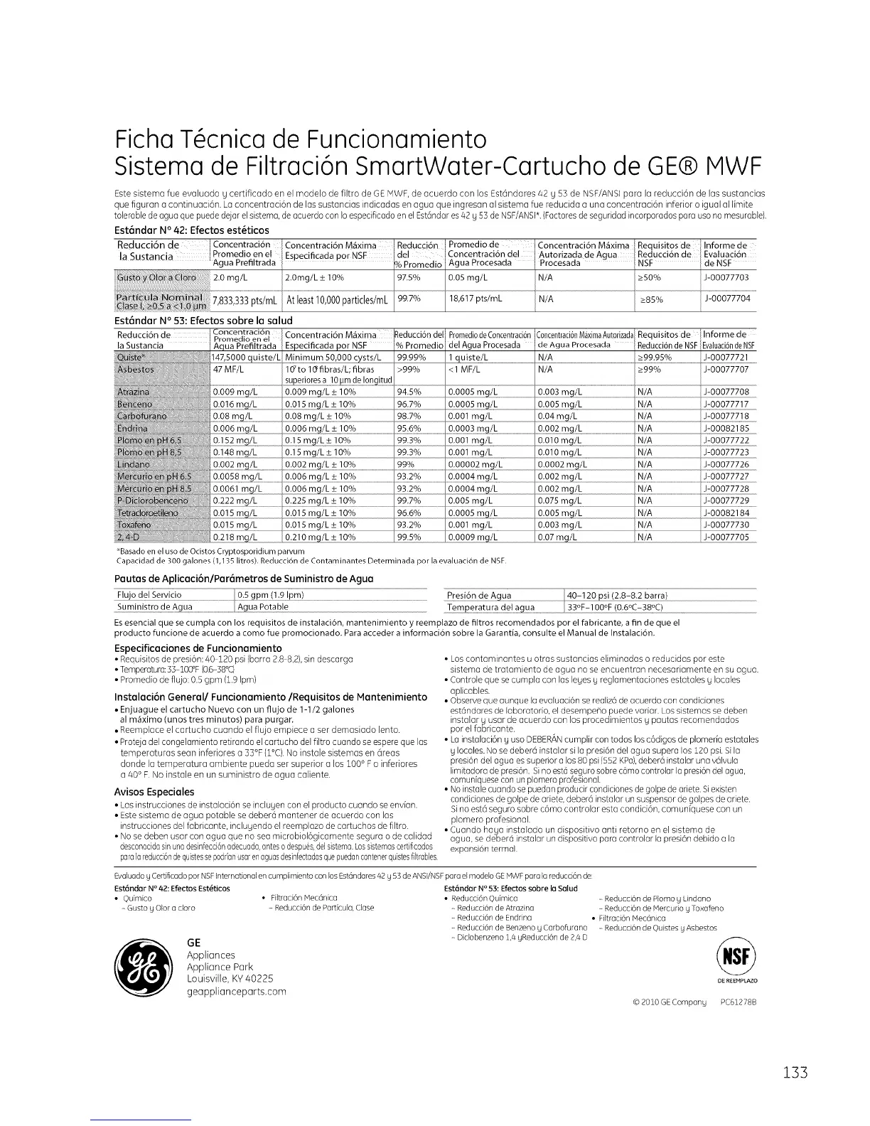 Estesistema fue evaluado g certificado en el modelo de filtro de GE MWF,de acuerdo con los Est6ndares 42 g 53 de NSF/ANSI para la reducci6n de las sustancias