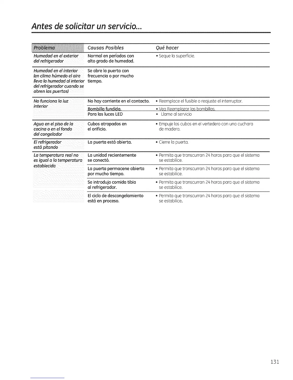 No funciona la luz No hay corriente en el contacto. • Reemplaceel fusible o reajuste el interruptor.