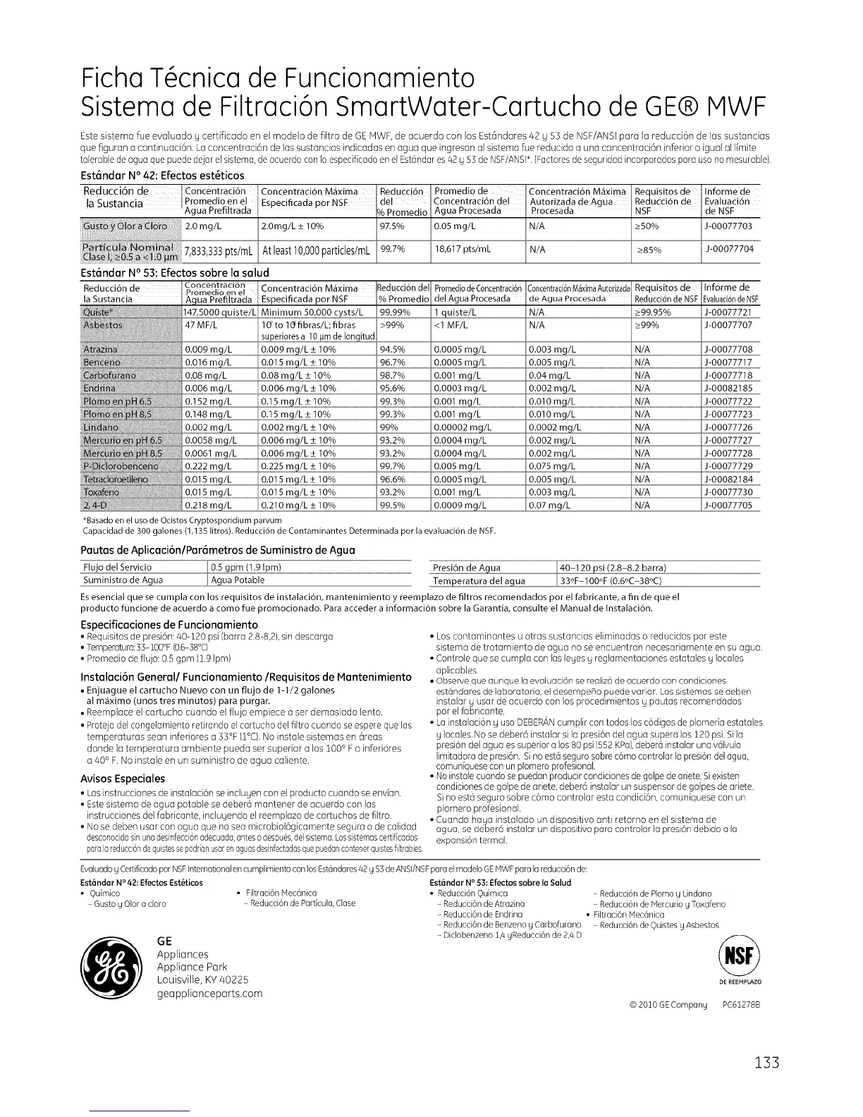 Este sistema fue evaluado g certificado en el modelo de filtro de GE HWF, de acuerdo con los Est6ndares 42 g 53 de NSF/ANSI para la reducci6n de las sustancias