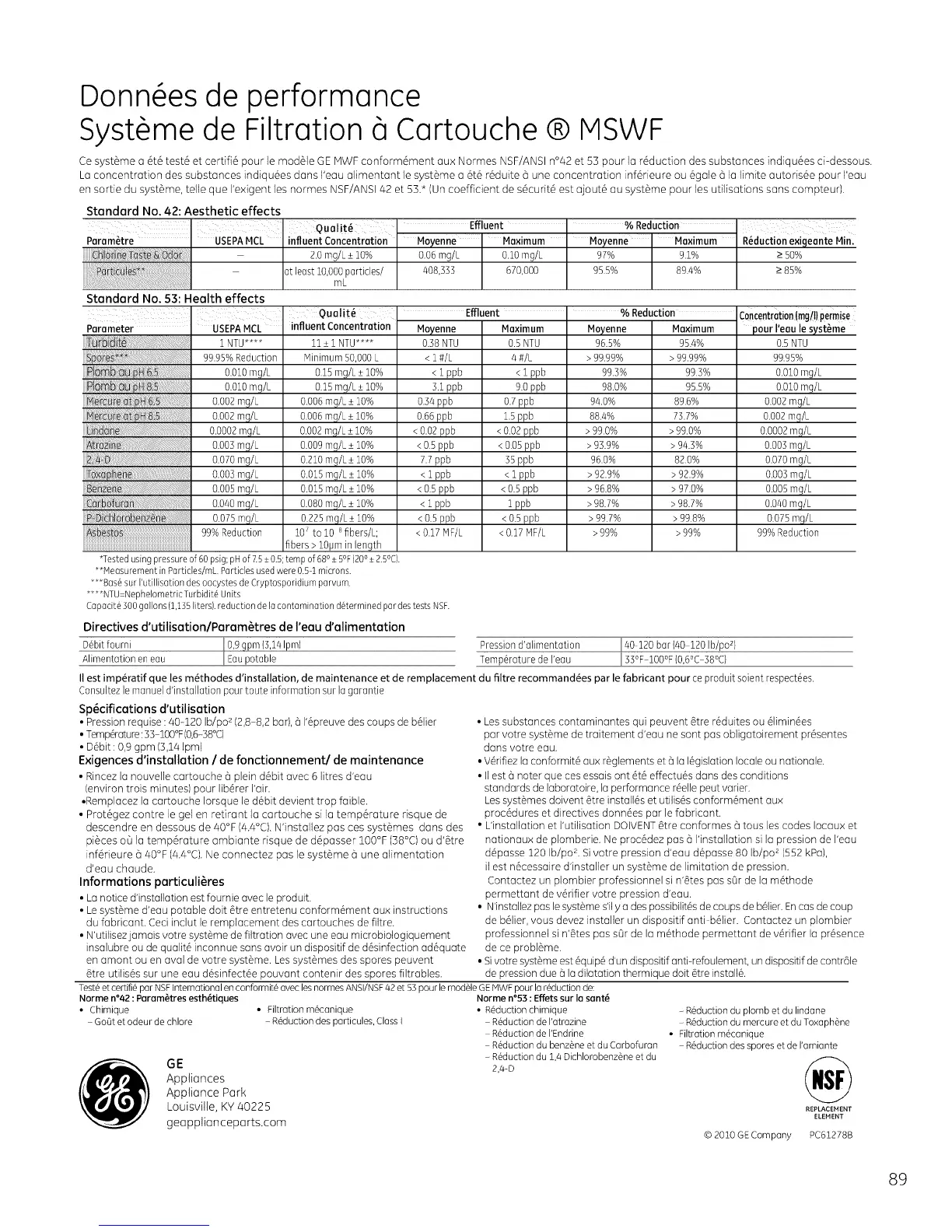 Ce systSme o St6 tests et certifi6 pour le modSle GE MWF conform6ment oux Normes NSF/ANSI n°42 et 53 pour Io r6duction des substances indiqu6es ci-dessous.