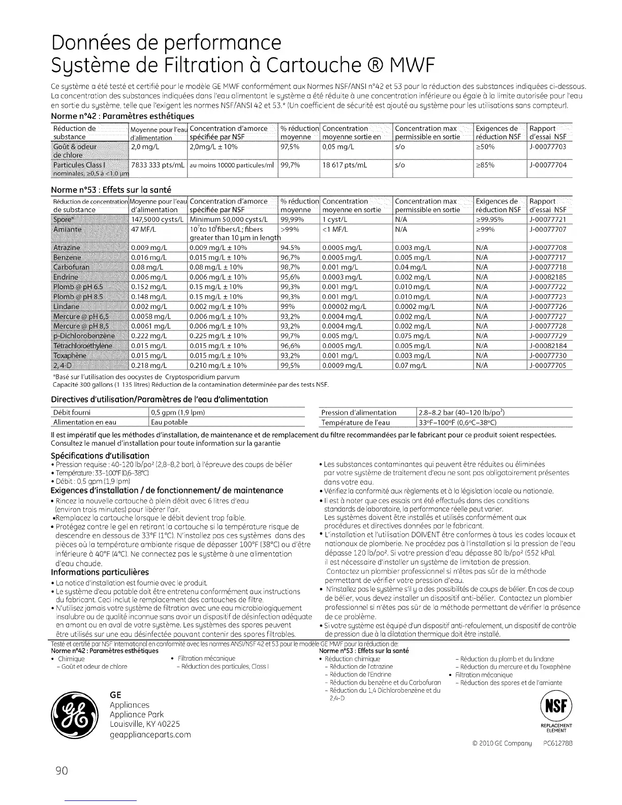 Ce systSme a 6tS tests et certifi6 pour le modSle GE IWF conformSment aux Normes NSF/ANSI n°42 et 53 pour la rSduction des substances (ndiqu6es d-dessous.