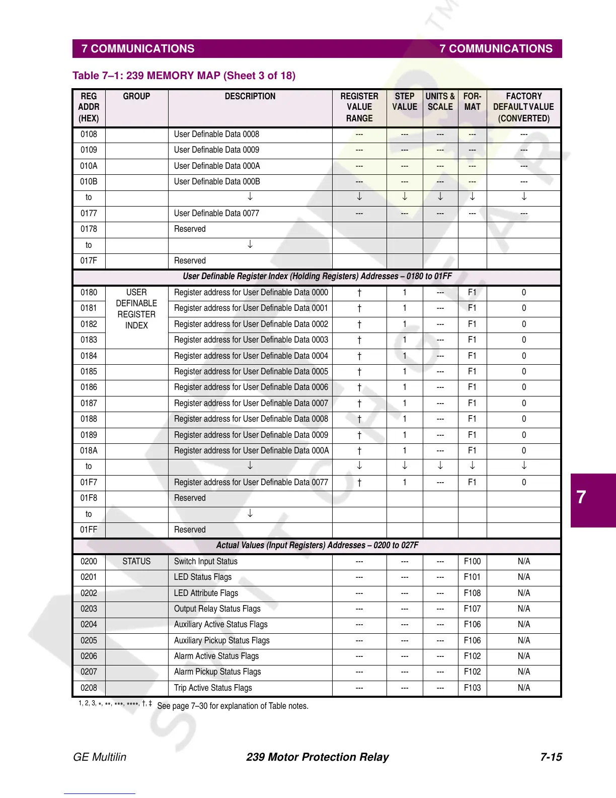 0187 Register address for User Definable Data 0007 † 1 --- F1 0