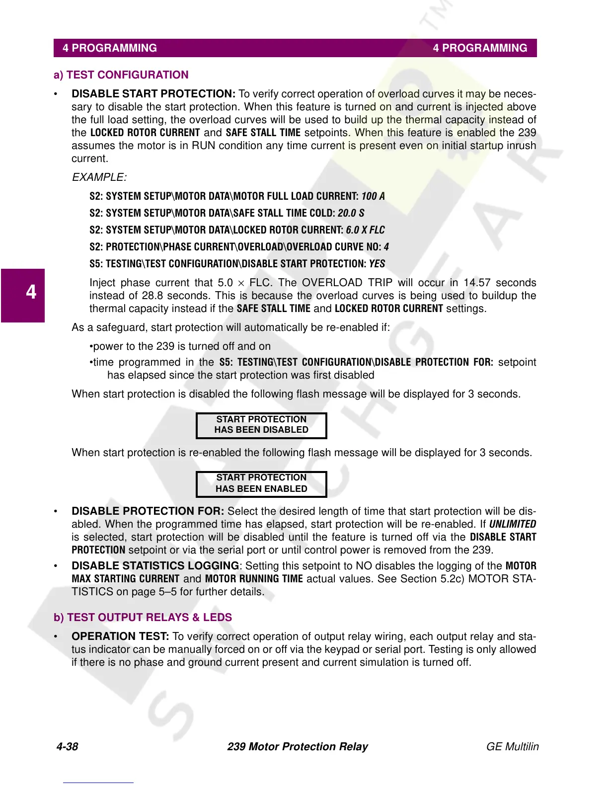 • DISABLE START PROTECTION: To verify correct operation of overload curves it may be neces-