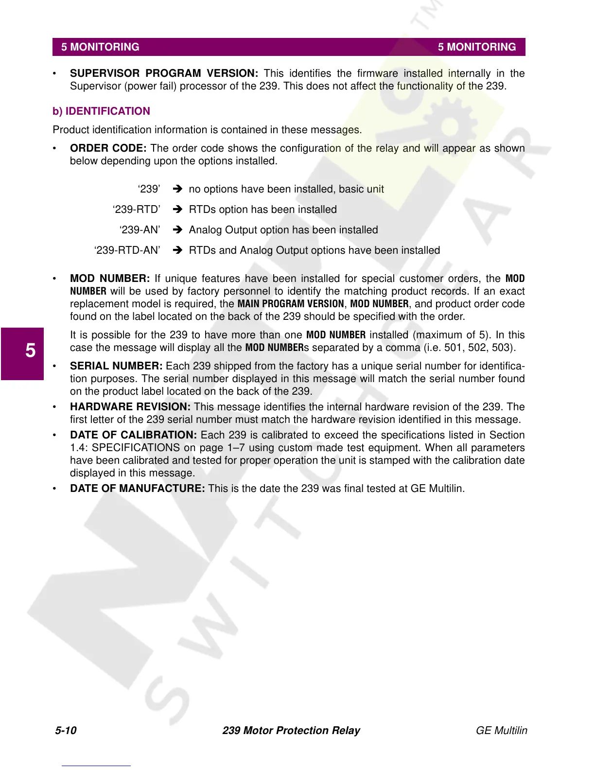 • DATE OF MANUFACTURE: This is the date the 239 was final tested at GE Multilin.